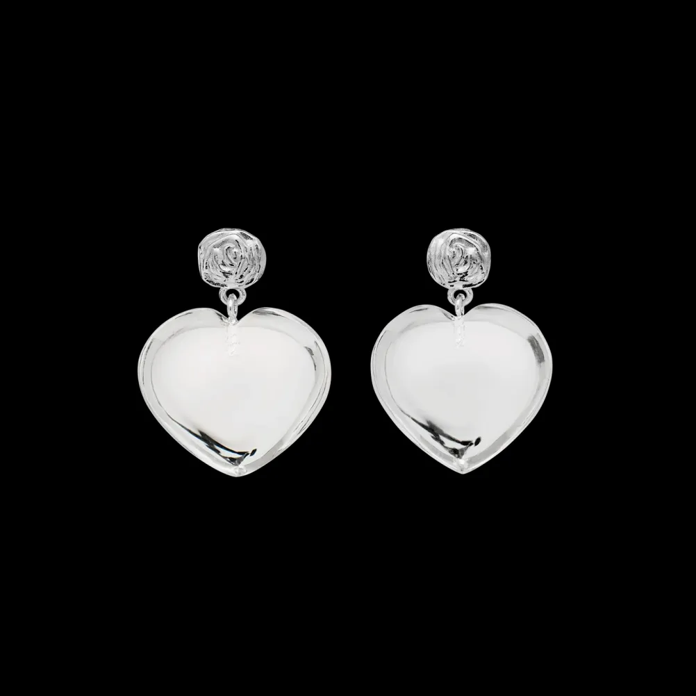 Smukke rose-øreringe med hjerteformede krystalvedhæng fra Maanesten. Fås både i guld og sølv.