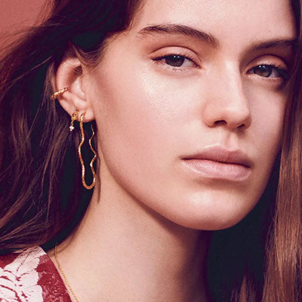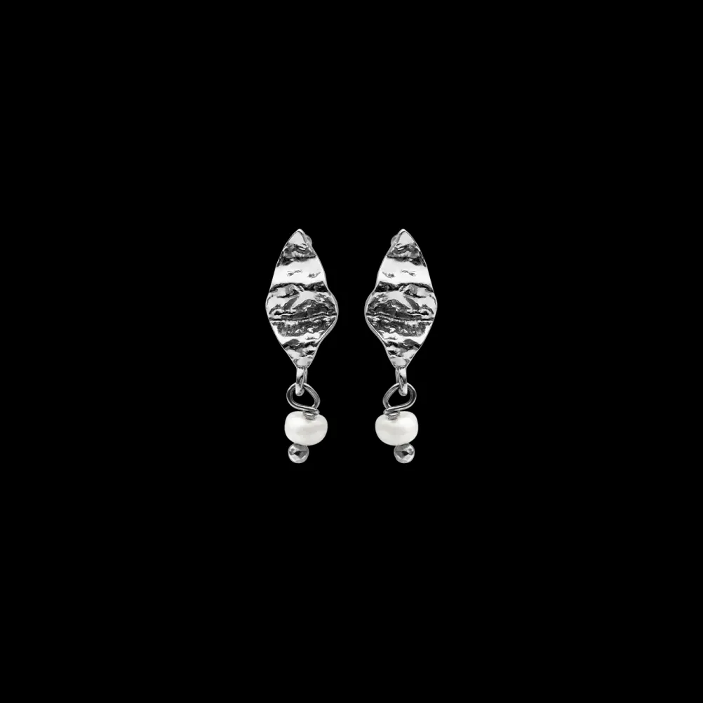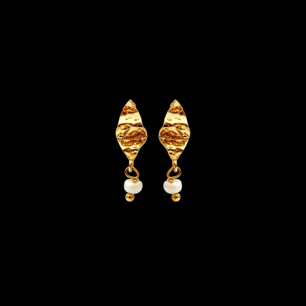 Fine øreringe i forgyldt sterlingsølv, blank poleret og med en banket bølget overflade samt små ferskvandsperler som vedhæng.