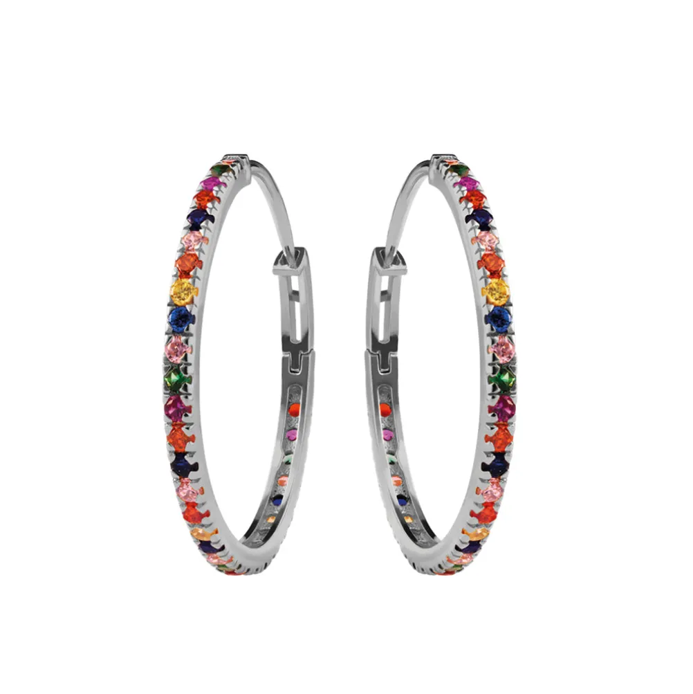 Smukke hoops øreringe med farverige zirkoner hele vejen rundt, lavet i forgyldt sterlingsølv og med blank finish. Elegante til hverdag og fantastiske til fest.