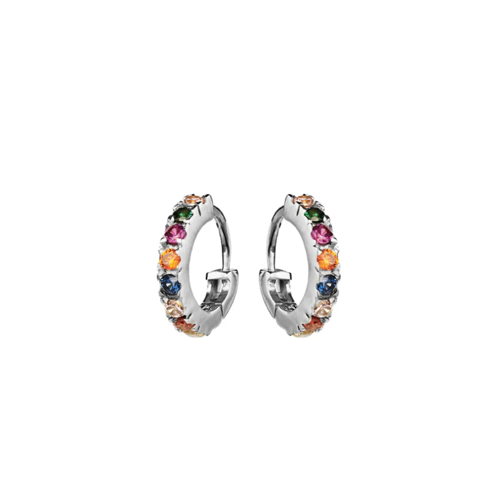 Små smukke hoops øreringe med farverige zirkoner hele vejen rundt, i forgyldt sterlingsølv og med blankt poleret finish. Elegante til hverdag og fantastiske til fest.