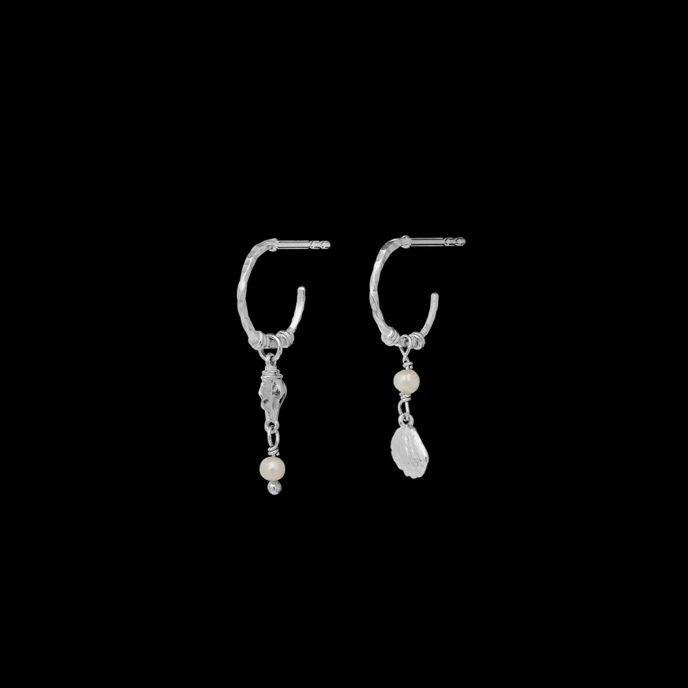 Smukke rustikke øreringe med vedhæng og små perler fra Maanesten. Fås både i guld og sølv.