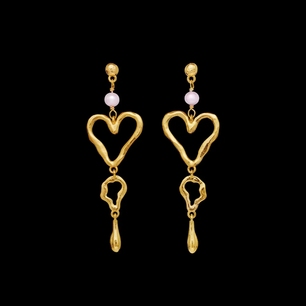 Smukke øreringe med hjerte-vedhæng og perler fra Maanesten. Fås både i guld og sølv.