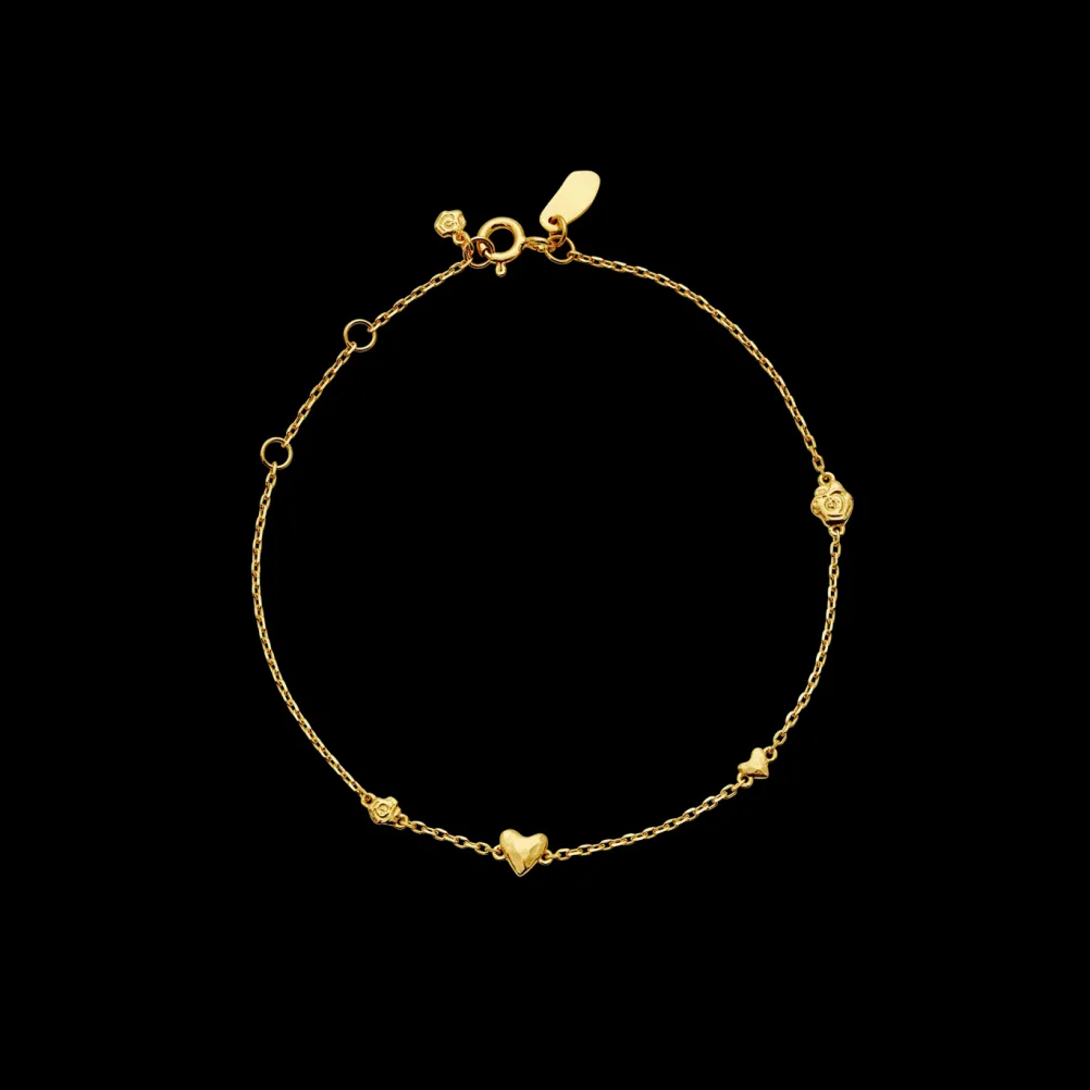 Smukt armbånd med rose- og hjertevedhæng fra Maanesten. Fås både i guld og sølv.