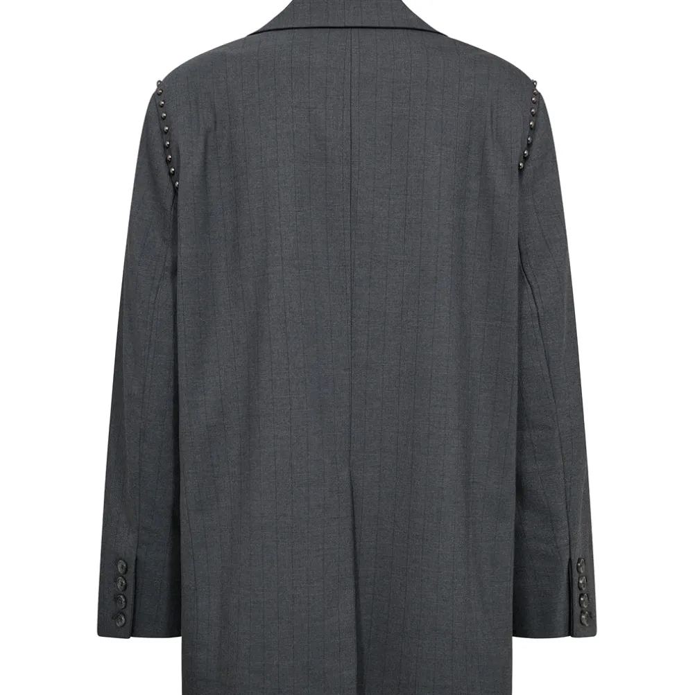 Elegant klassisk nålestribet blazer fra Mos Mosh med enkelttradet lukning. Med små fine sølvfarvede perler/nitter ved skuldrene.