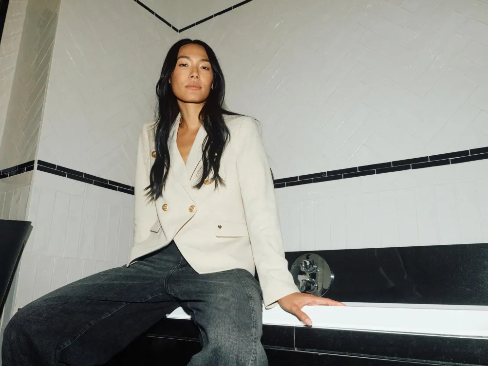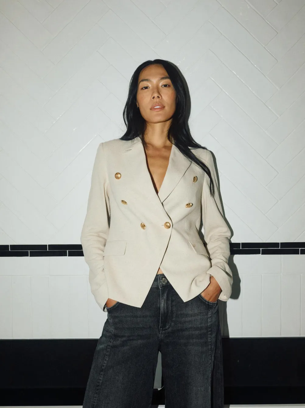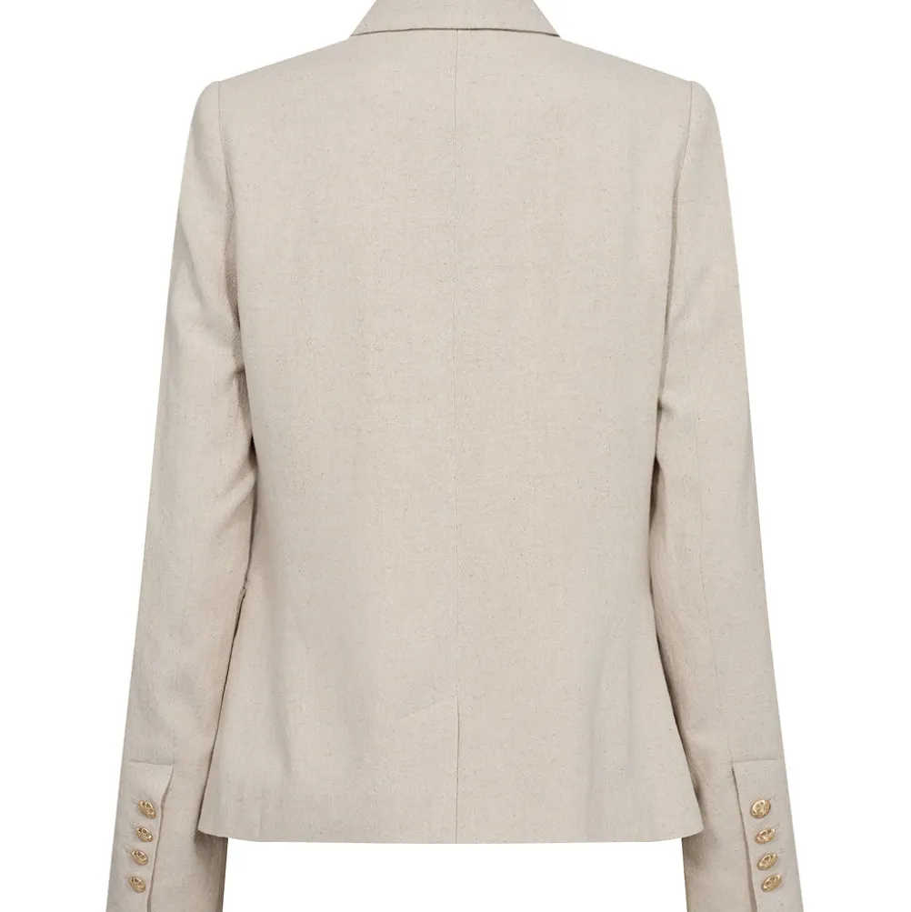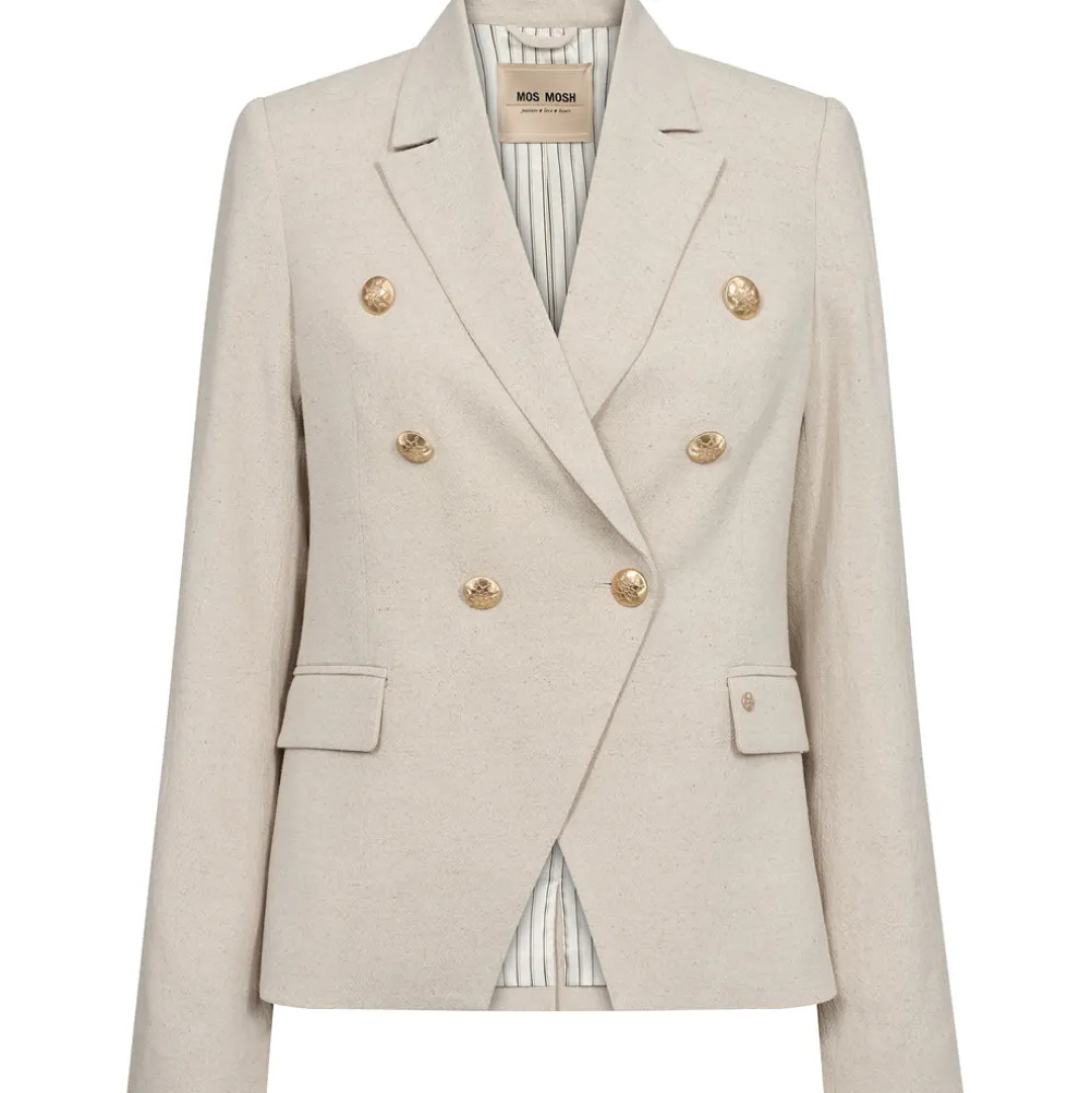 Smuk og elegant dobbelttradet blazer fra Mos Mosh med flotte guldknapper, revers, sidelommer og slids foran ved åbningen. Perfekt til både hverdag og fest.