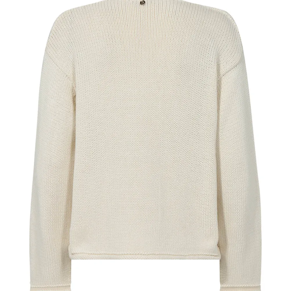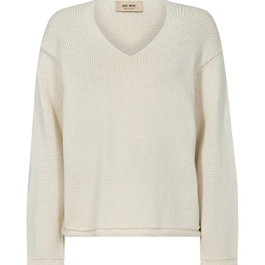Skøn strik fra Mos Mosh med v-udskæring og drop-down skuldre, samt fine bøjede kanter. Kan styles med det meste.