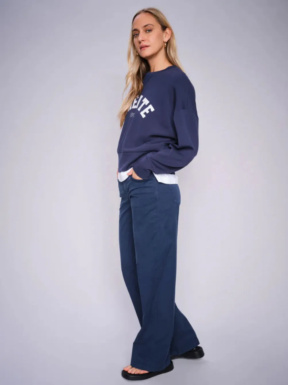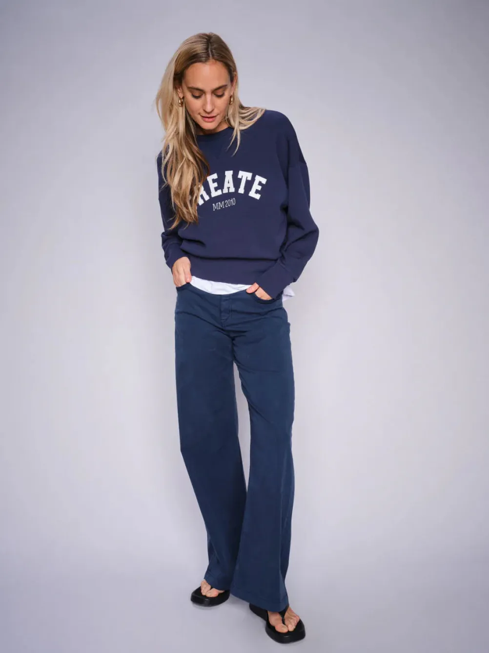 Flotte mørkeblå 70’er inspirerede jeans fra Mos Mosh designet i en elegant wide-leg-pasform med høj talje og fremstillet i en behagelig bomuldsblanding. Med en flot knap ved lukningen som finish.