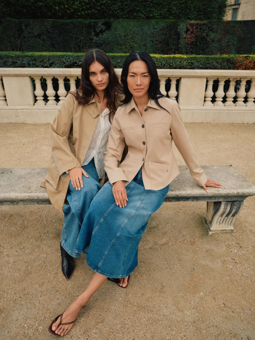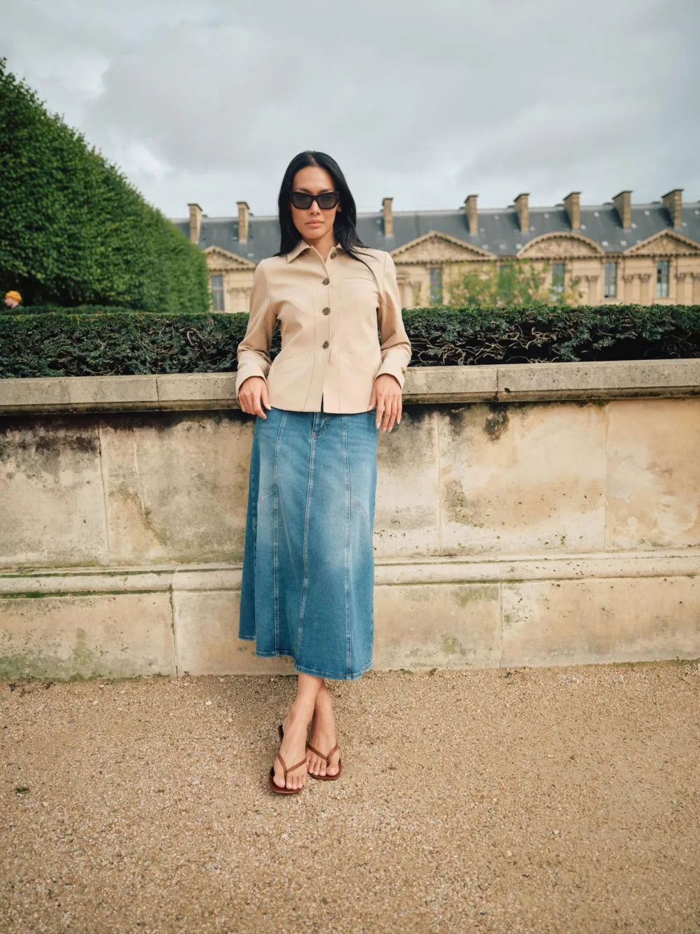 Flot og elegant lang denimnederdel fra Mos Mosh med fine detaljer. Designet i et a-snit, som går til lige under knæene. Med flere indsnit som en cool finish.