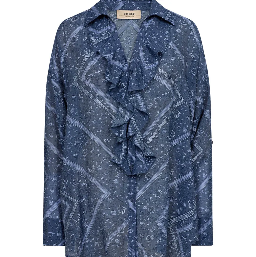 Smuk lang bluse fra Mos Mosh med flot grafisk mønster og v-udskæring med fine flæser. Perfekt til både hverdag og fest.