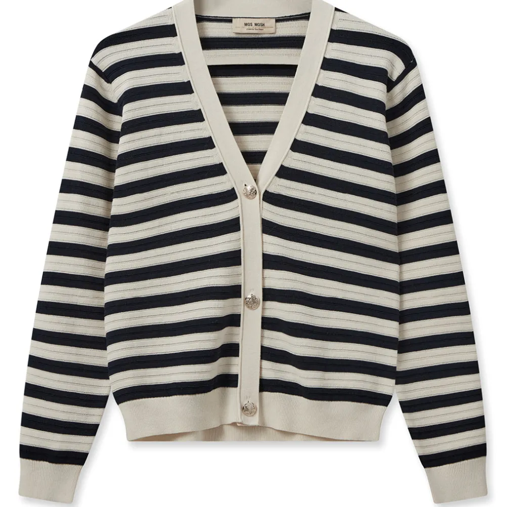 Lækker stribet cardigan fra Mos Mosh med smukke guldknapper. Designet i en løs silhuet med en flot V-hals og knaplukning, som passer perfekt til både jeans og bukser.