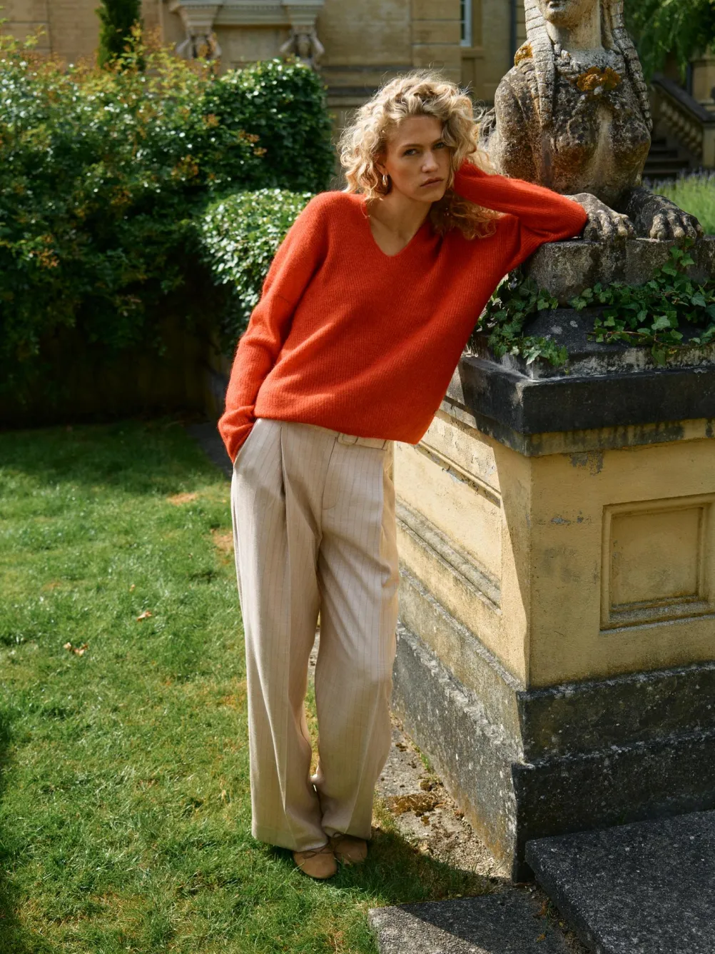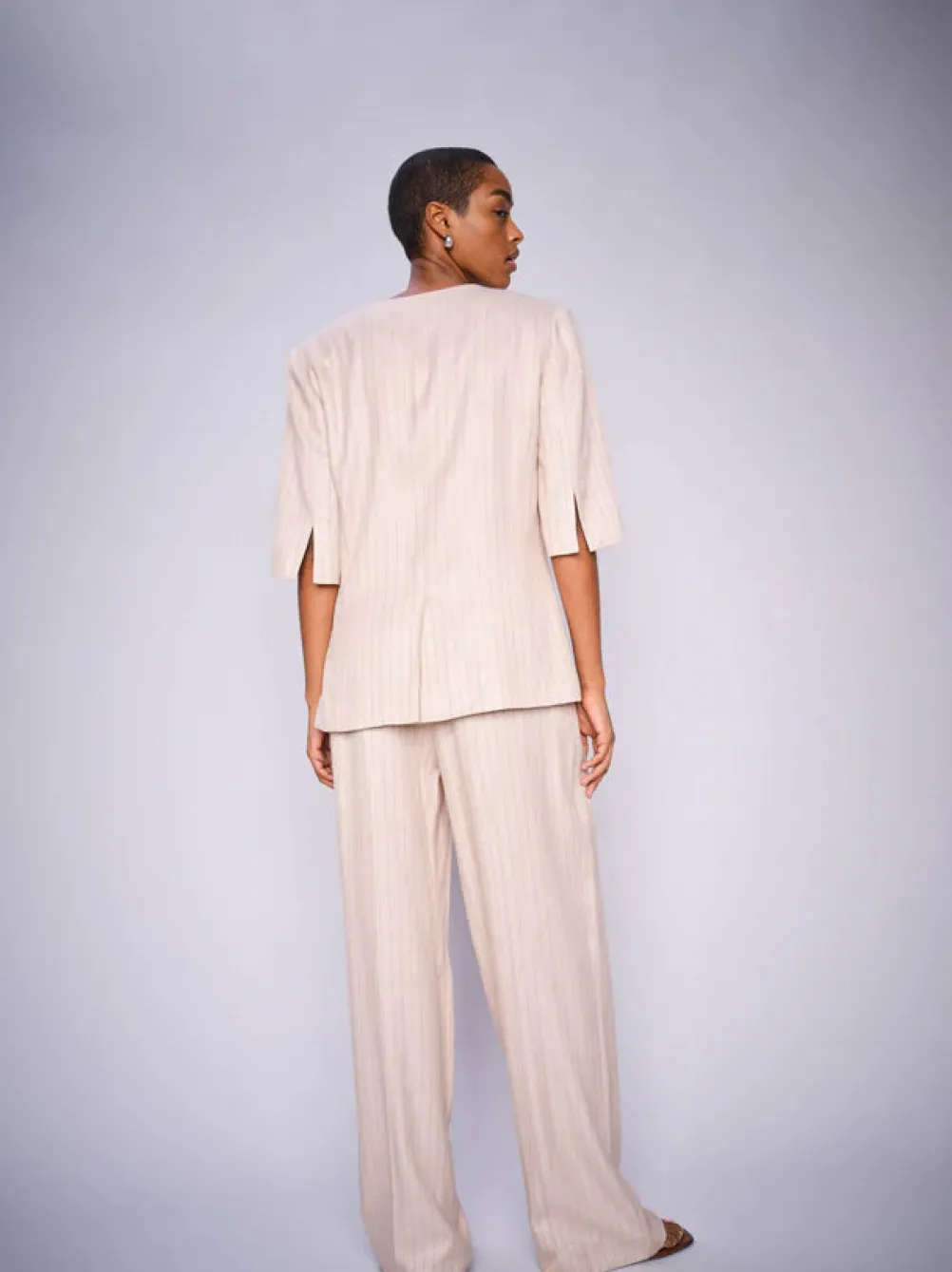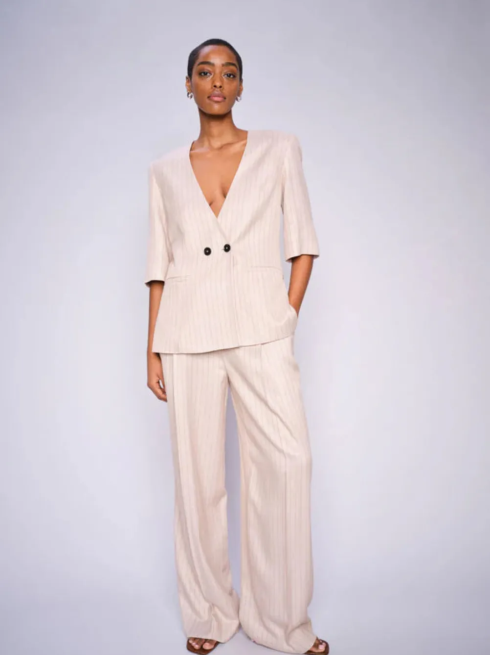 Flotte og elegante nålestribede bukser fra Mos Mosh med lige ben med pressefoldere og høj talje med matchende bælte. Perfekte til både hverdag og fest.