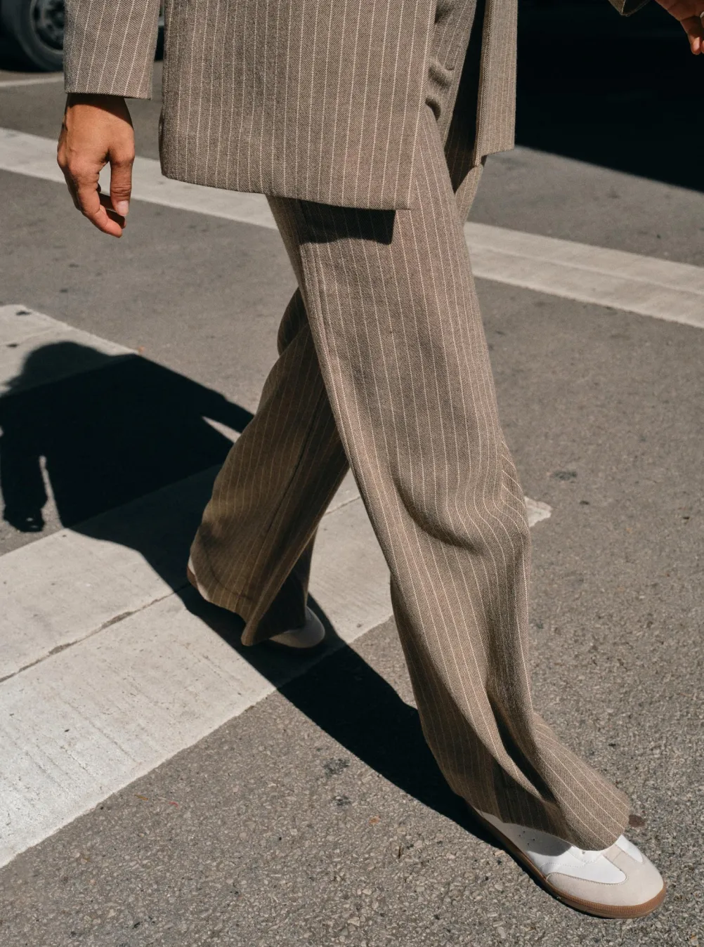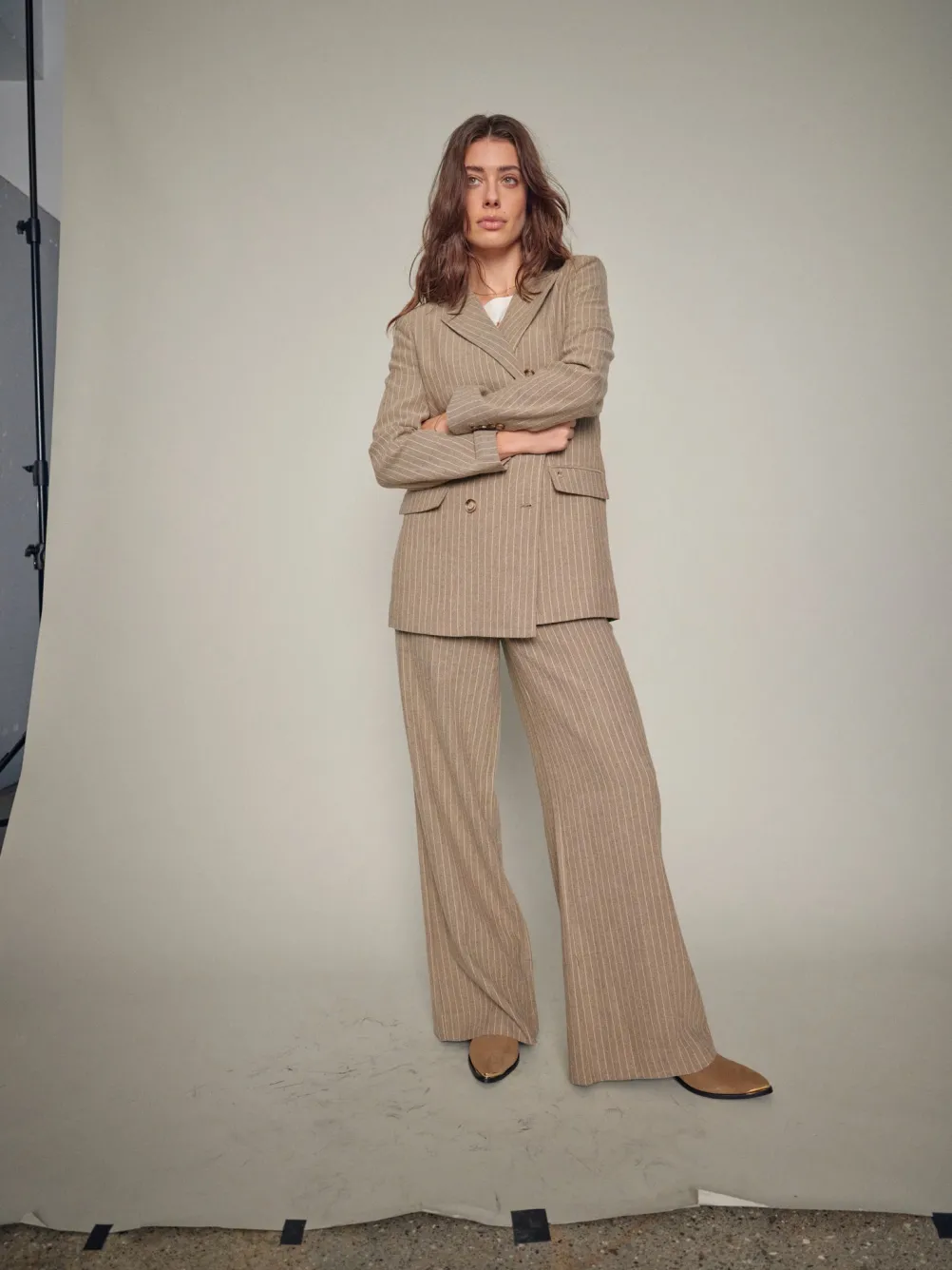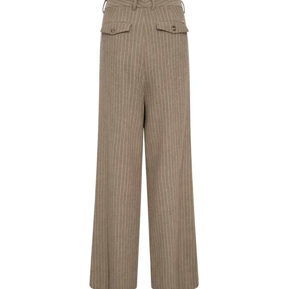 Flotte stribede klassiske bukser fra Mos Mosh. Med brede ben og høj talje. Med sidelommer, knaplukning og bæltestropper.