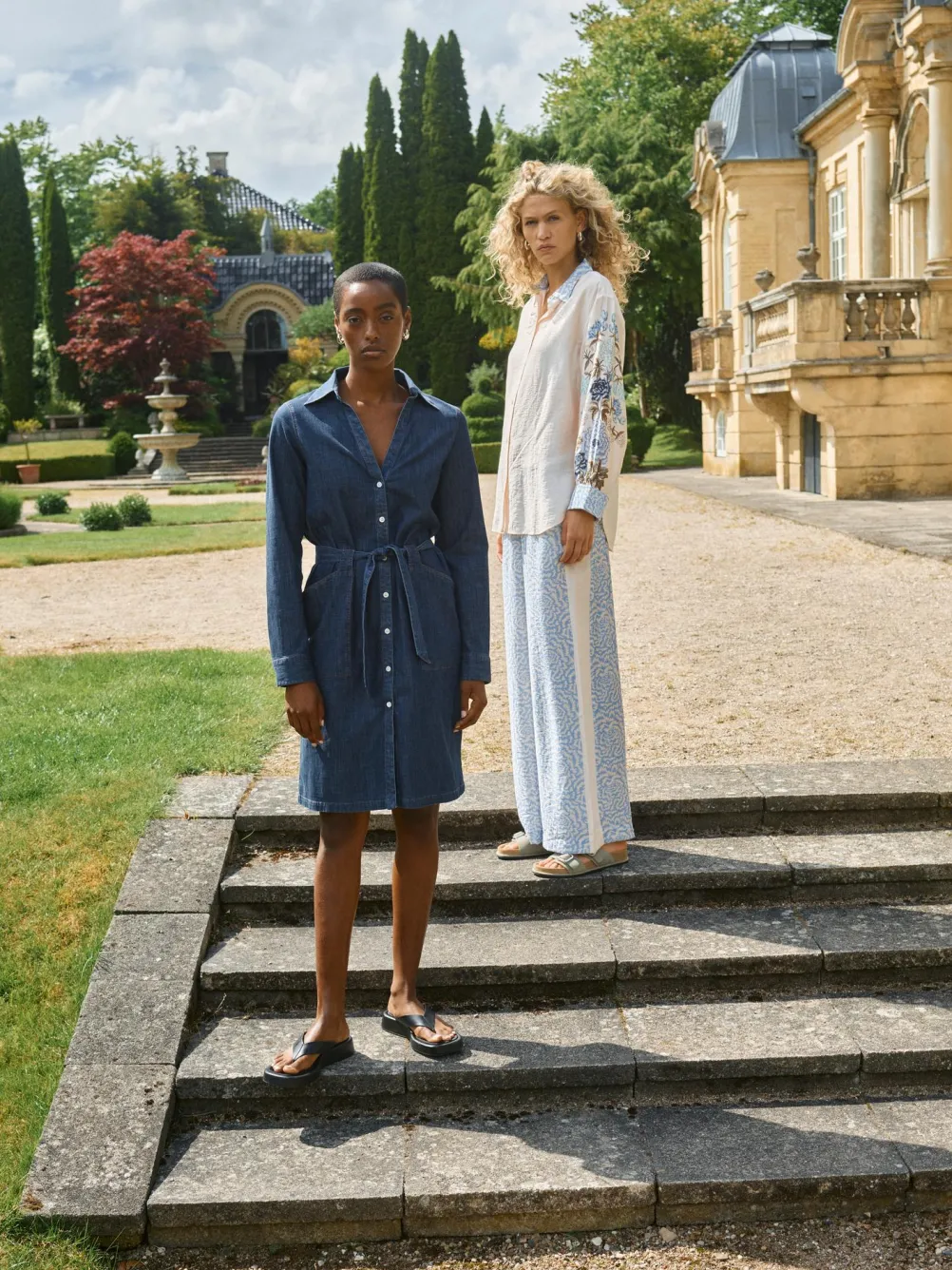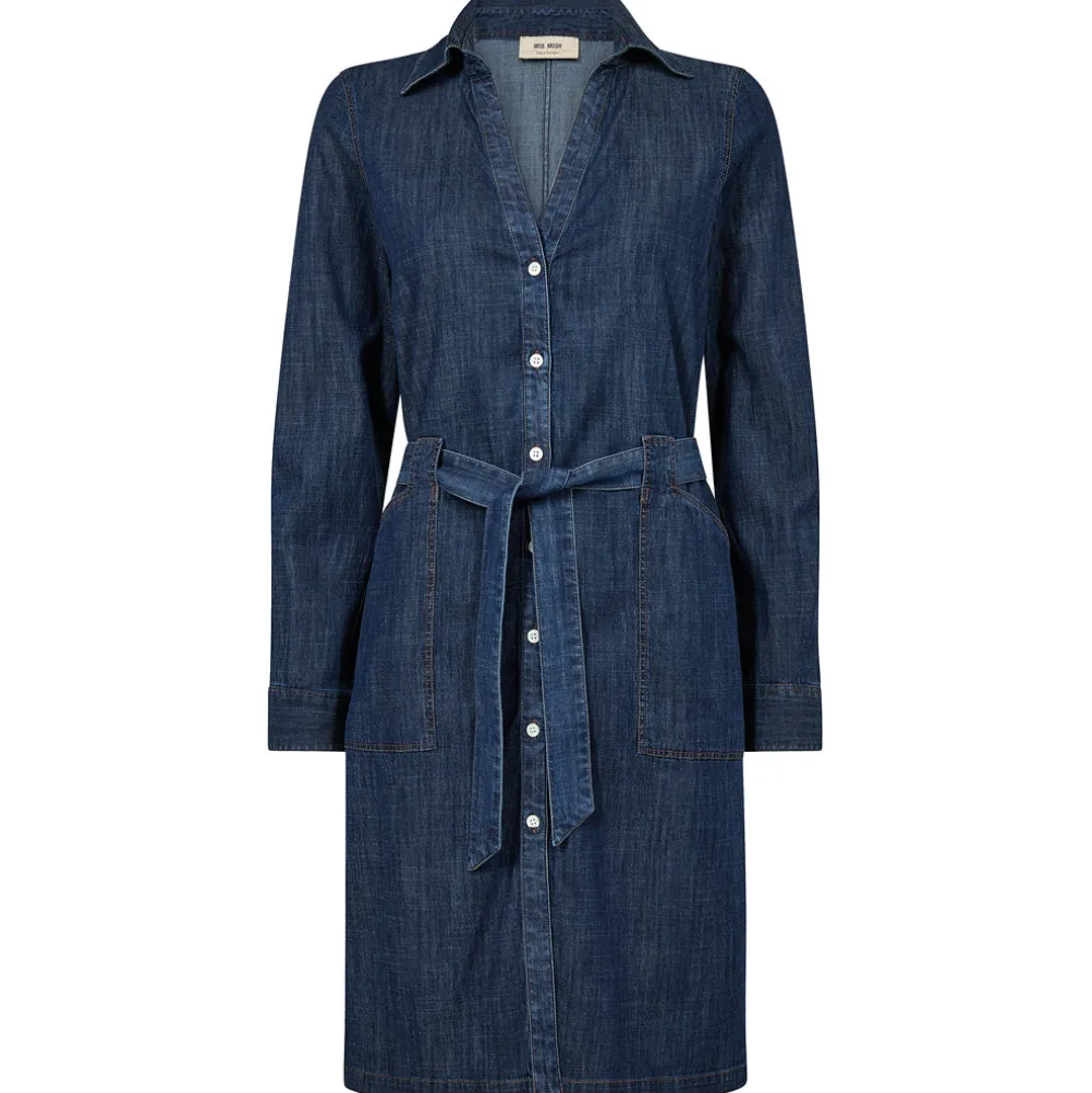 Flot elegant denimkjole fra Mos Mosh med v-udskæring og bindebånd i taljen. Fremstillet i en blød blanding af bomuld og tencel.