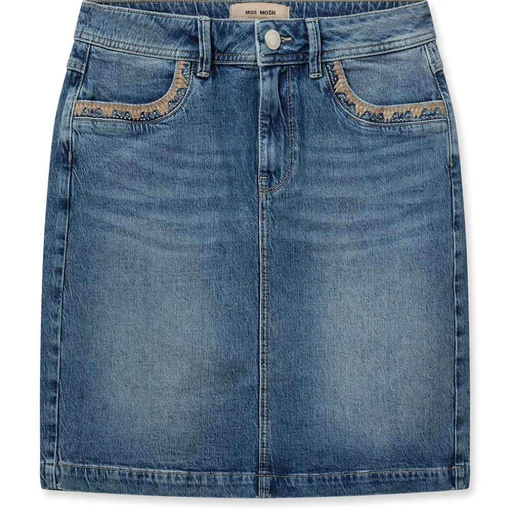 Lækker kort denimnederdel fra Mos Mosh med fine detaljer. Med dekorative broderier ved lommerne og lædermærke bagpå som finish.