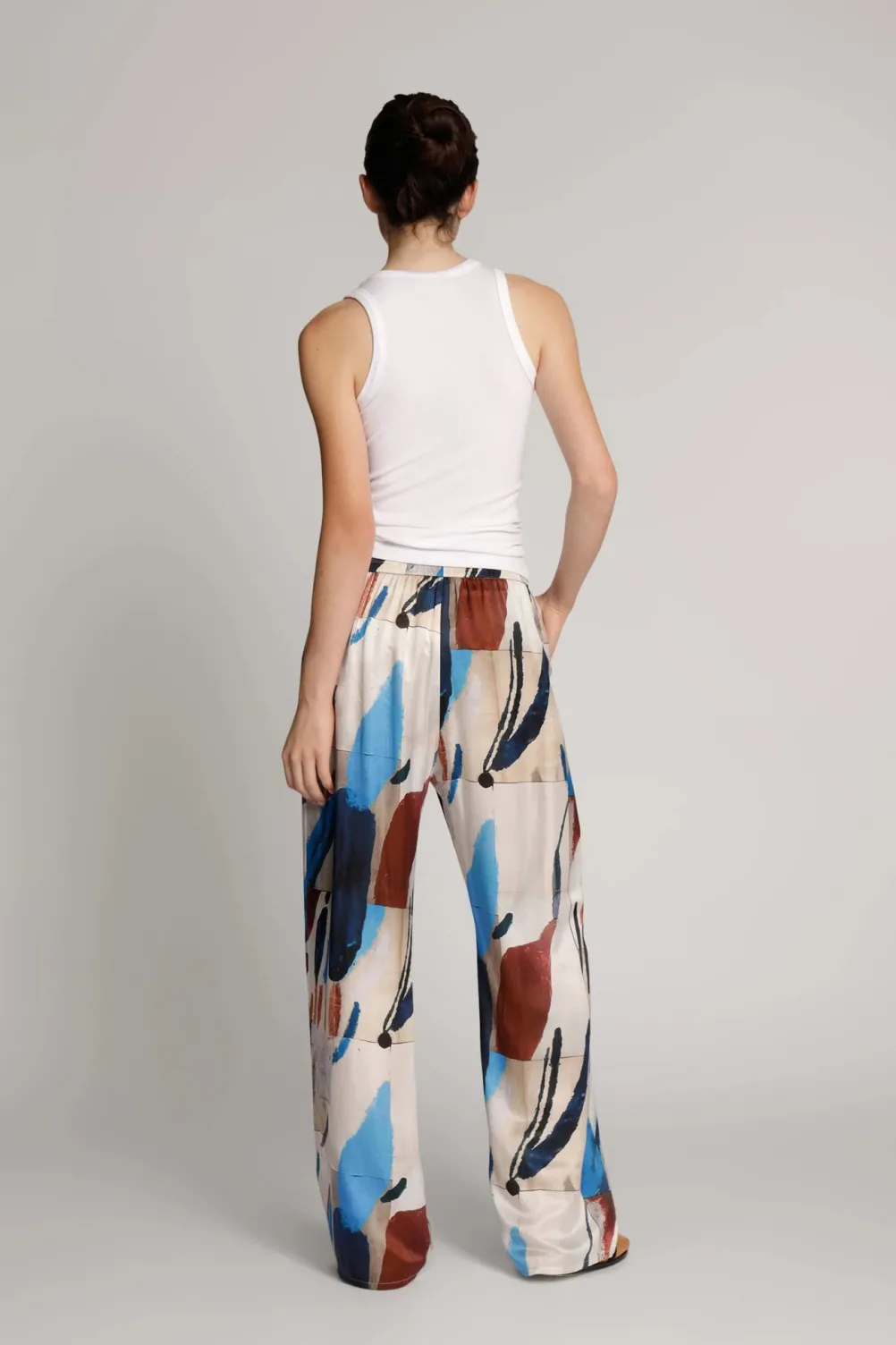 Smukke lange løse bukser i silkeblanding med flot unikt print fra Munthe. Bukserne har elastik i taljen og lommer.