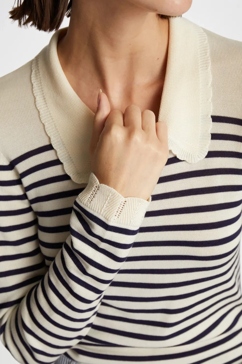 Elegant stribet strik fra Munthe med krave og med fine strikkede blondedetaljer. Lavet i en blød uldblanding.
