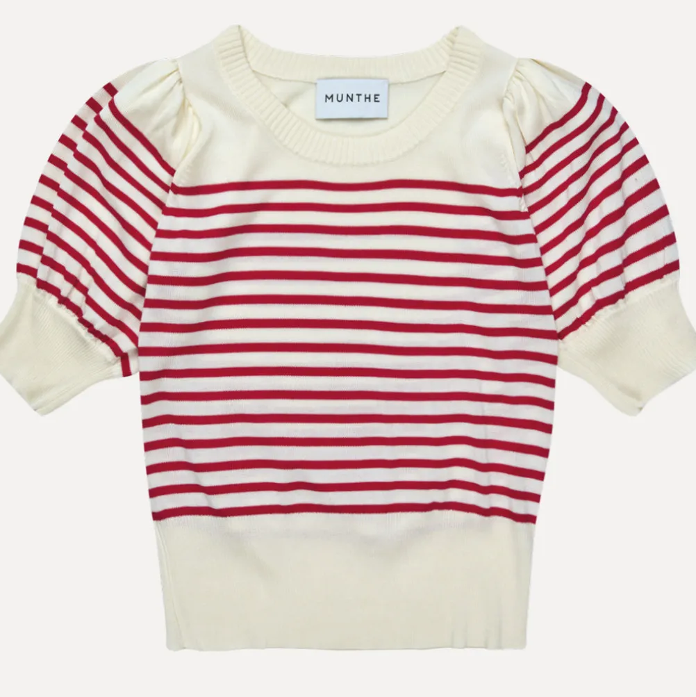 Flot kortærmet strik fra Munthe med striber og puffærmer med skulderpuder. Lavet i en blød uldblanding.