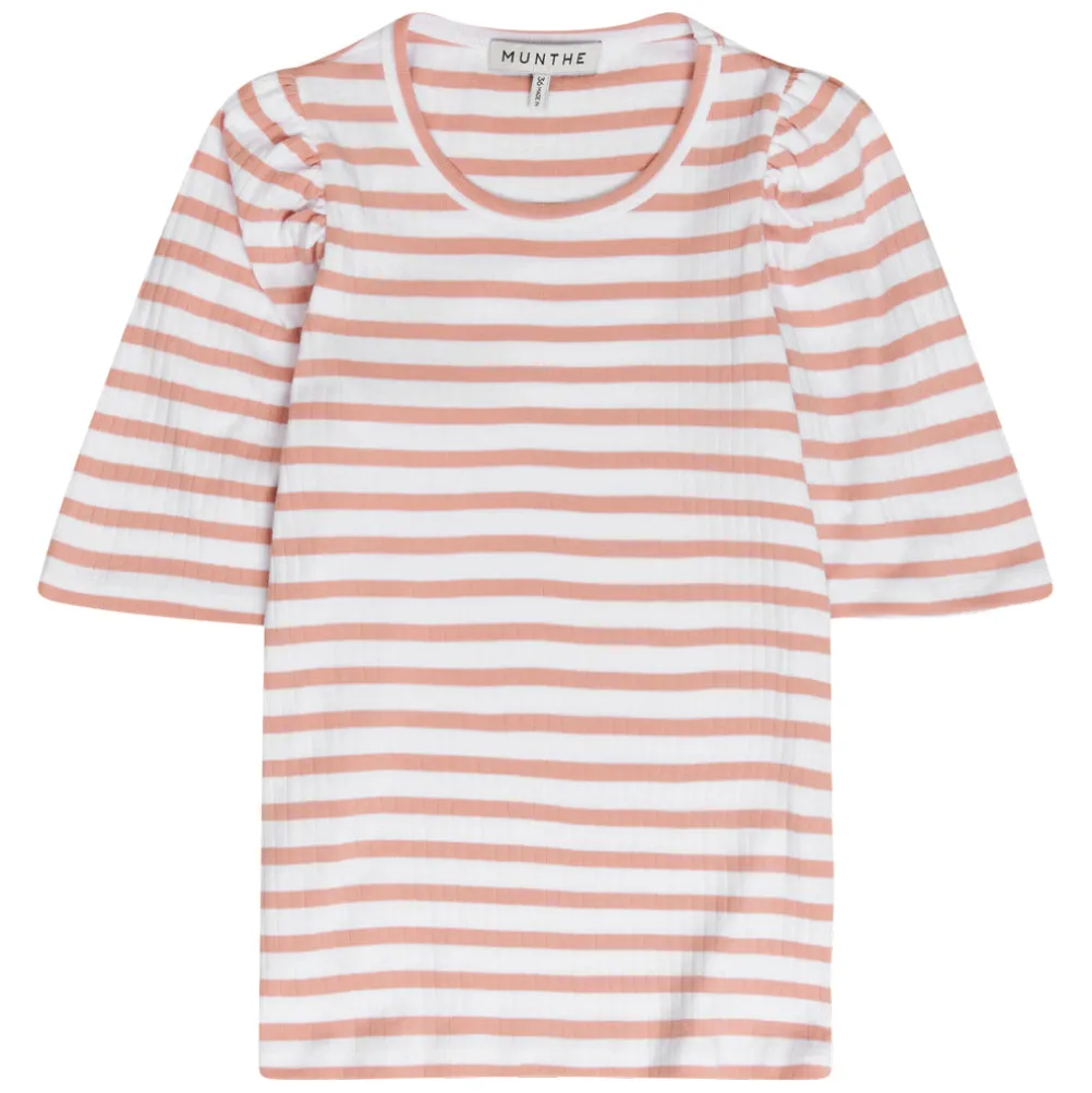 Fin stribet t-shirt fra Munthe i farven rose. T-shirten har rund hals og trekvart ærmer.