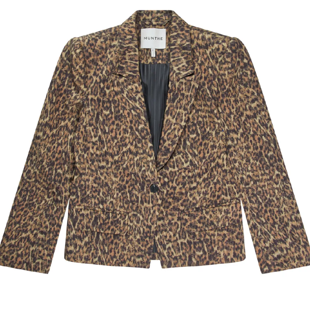Super flot kort leopardblazer fra Munthe lige skuldre, lange ærmer og klaplommer foran. Tæt pasform.