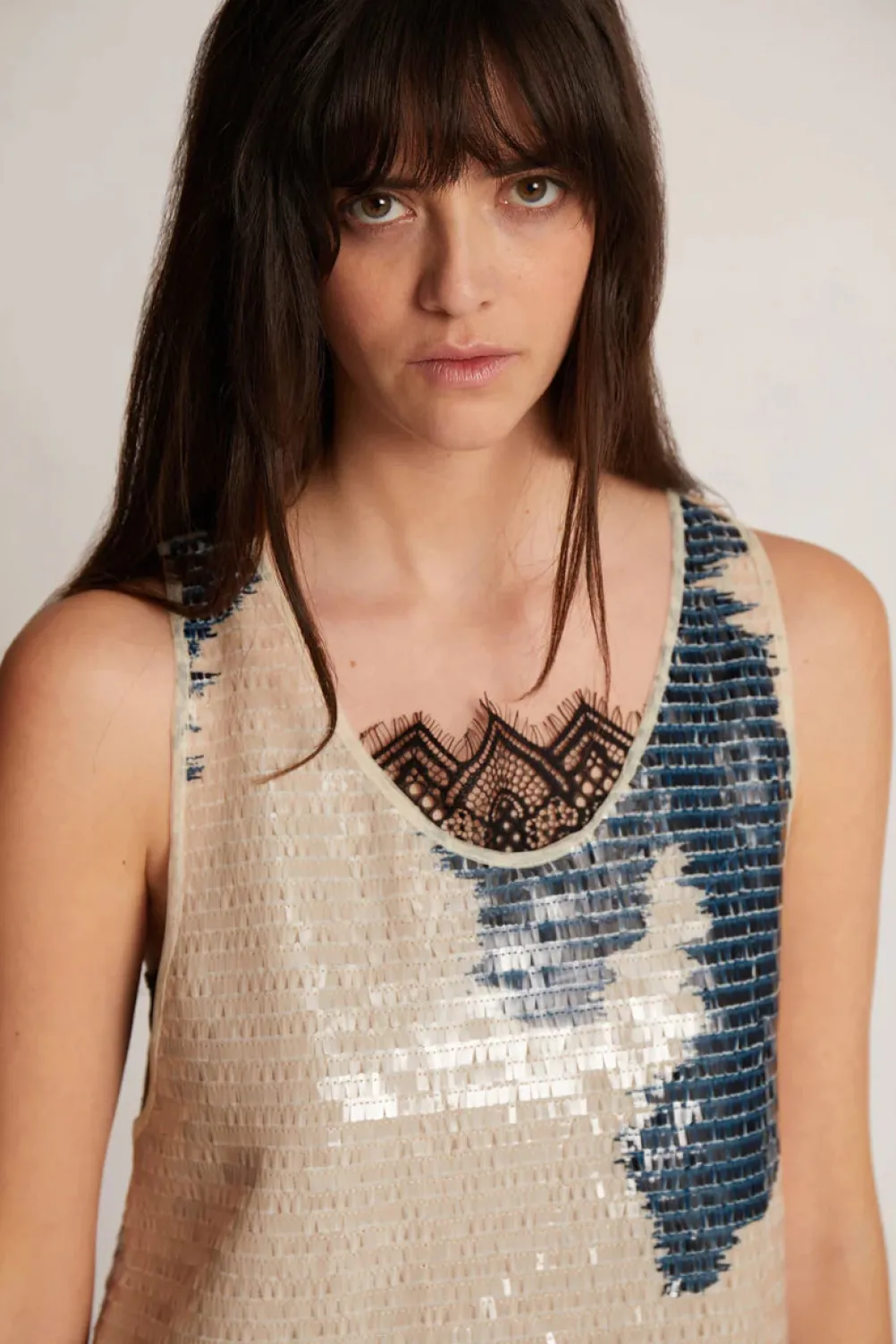 Smuk og unik pallietkjole fra Munthe med flotte detaljer! Med blondeunderkjole, som kan ses ved udskæringen og forenden af kjolen. Underkjolen og pallietkjolen kan bæres hver for sig. Perfekt til festlige begivenheder.
