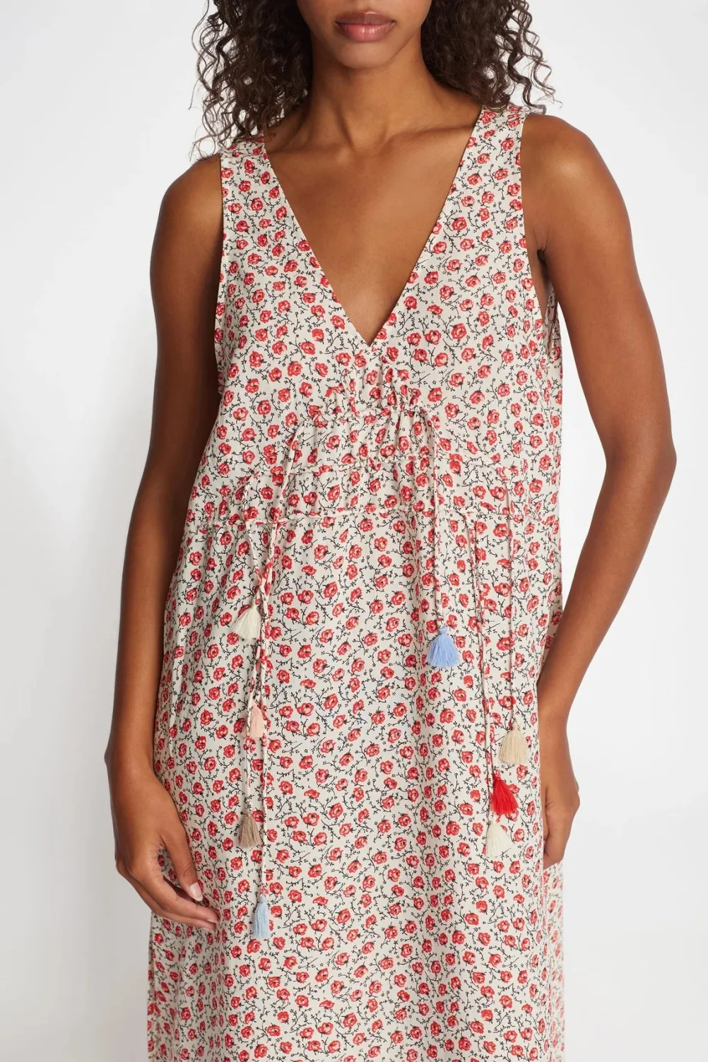 Flot boho-inspireret kjole fra Munthe med flot rødt blomsterprint og bindebånd med kvaster i forskellige farver.