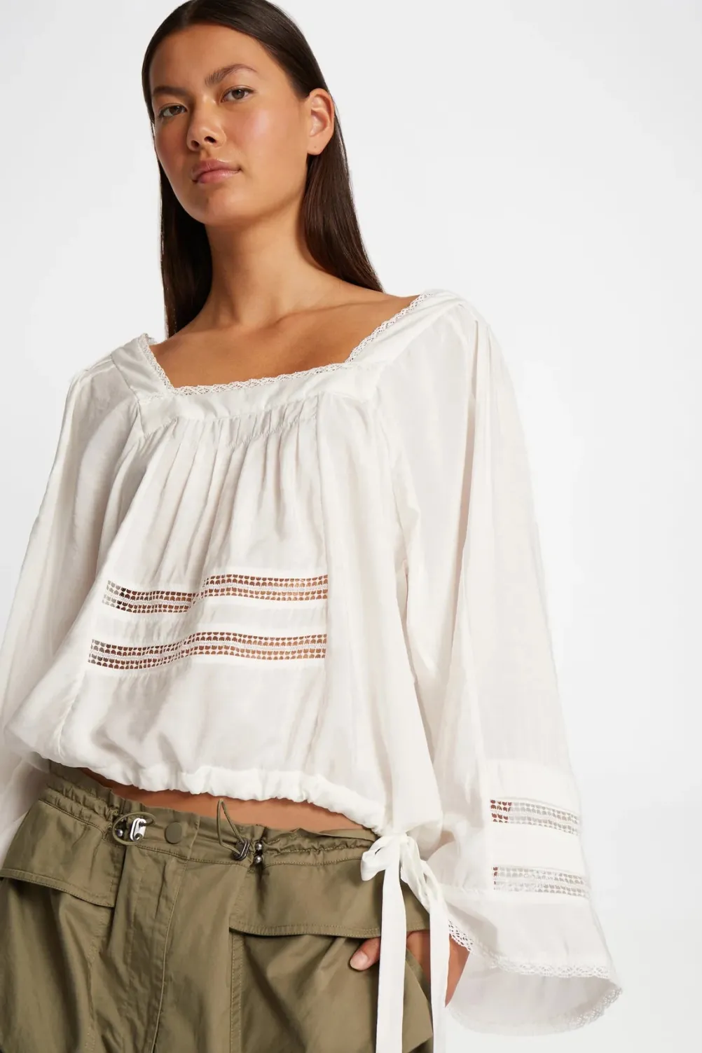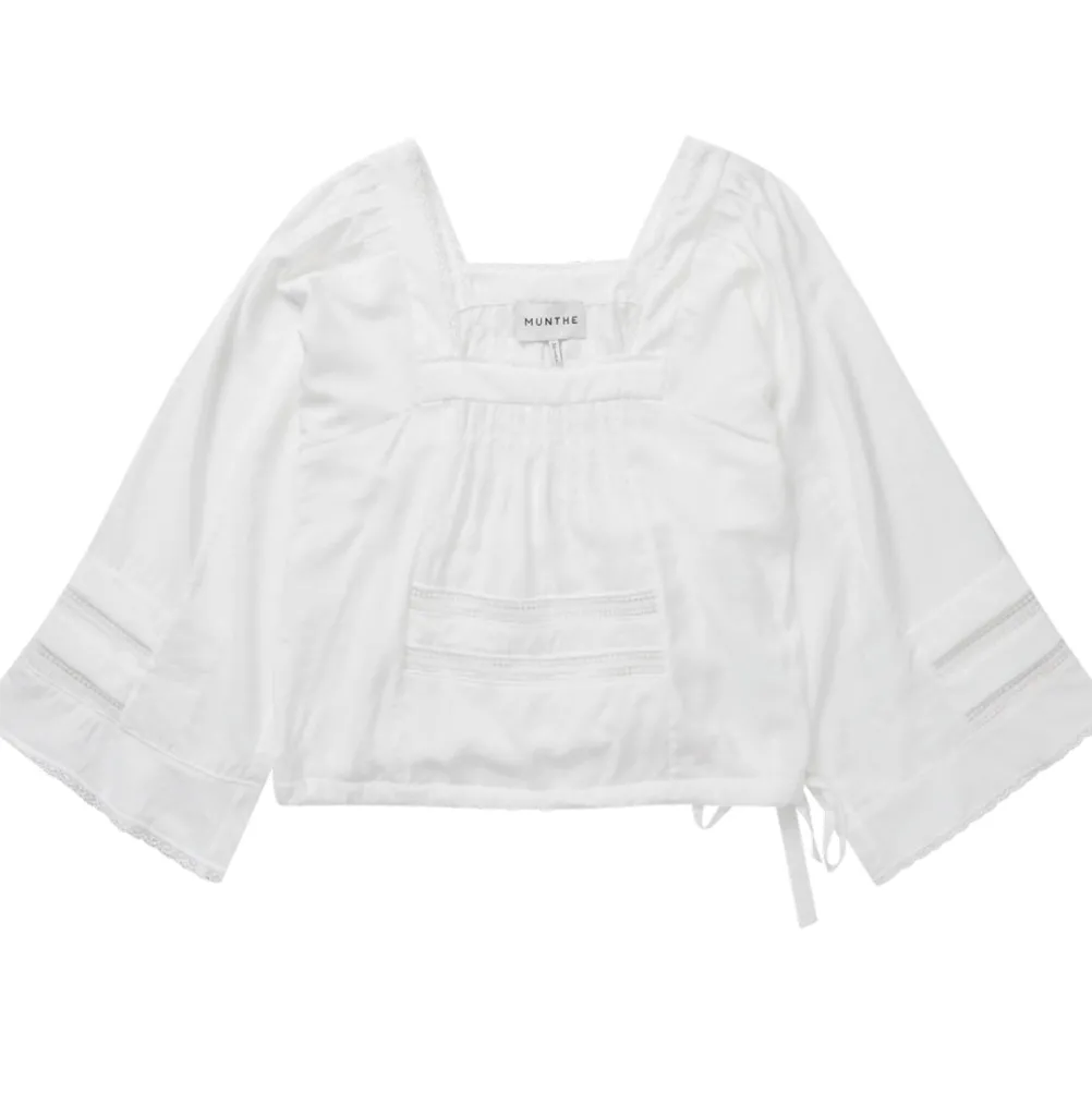Smuk boheme bluse fra Munthe med fine blondebånd og firkantet halsudskæring. Med brede ærmer og bindebånd i taljen.