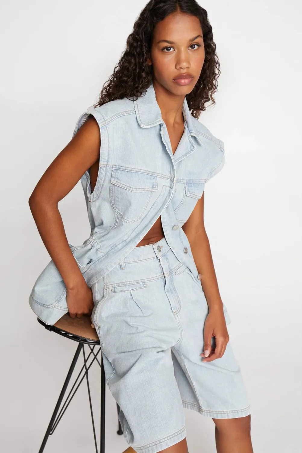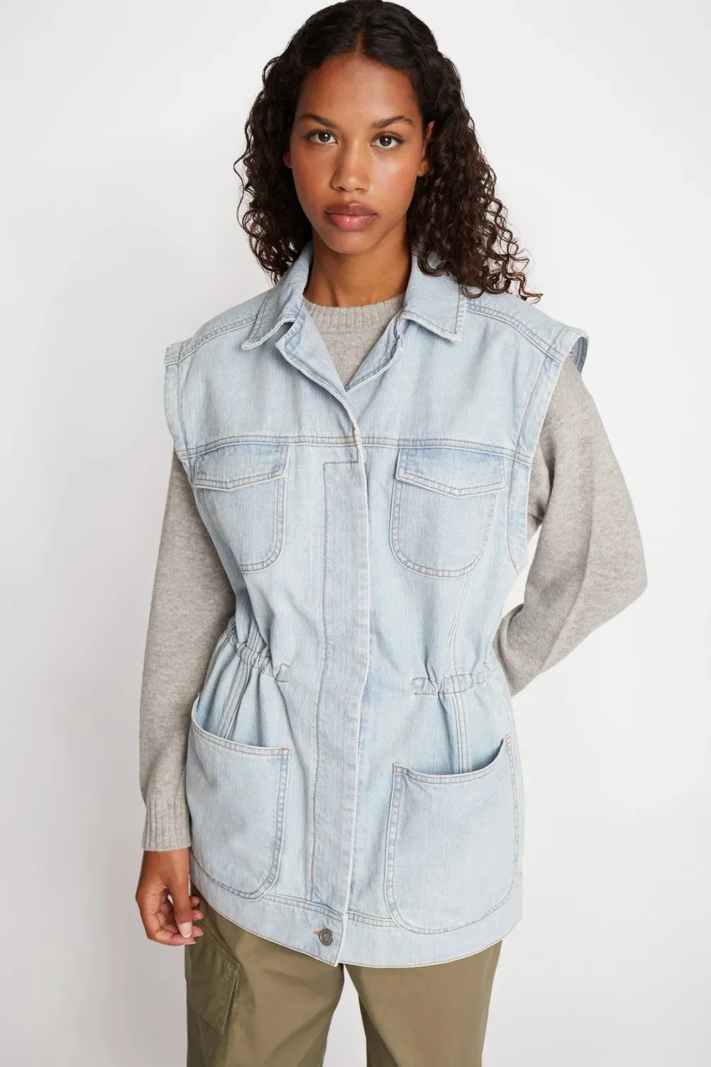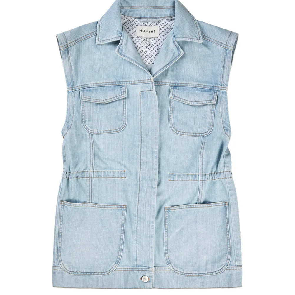 Cool lyseblå denimvest fra Munthe med forskellige lommer og krave. Med foer med Munthe logo. Med snøre i taljen, som kan justeres.