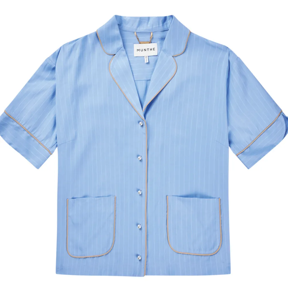 Smuk blå nålestribet skjorte med korte ærmer og fine perleknapper fra Munthe.