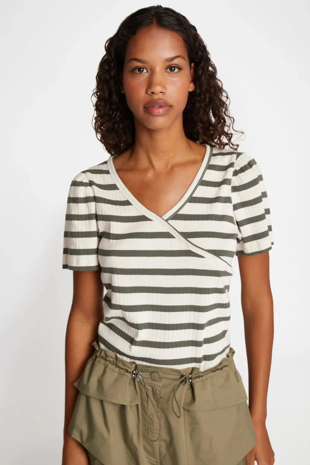 Fin stribet t-shirt fra Munthe med slå-om effekt. Normal pasform og korte ærmer med et let puf ved skulderen.