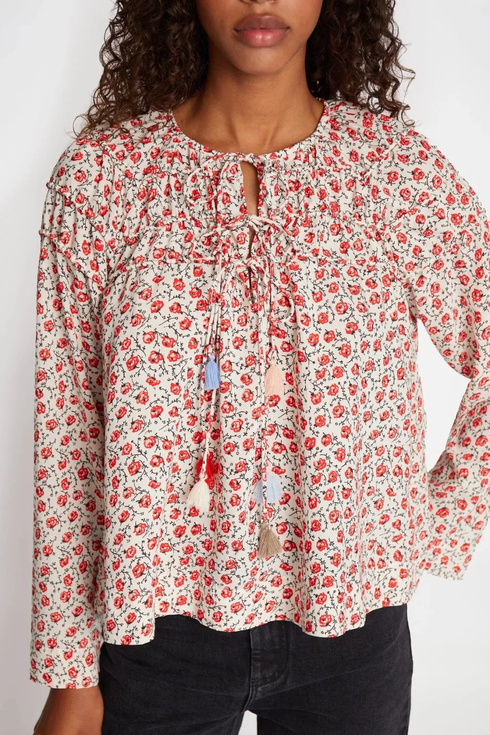 Flot boho-inspireret bluse fra Munthe med flot rødt blomsterprint og bindebånd med kvaster i forskellige farver.