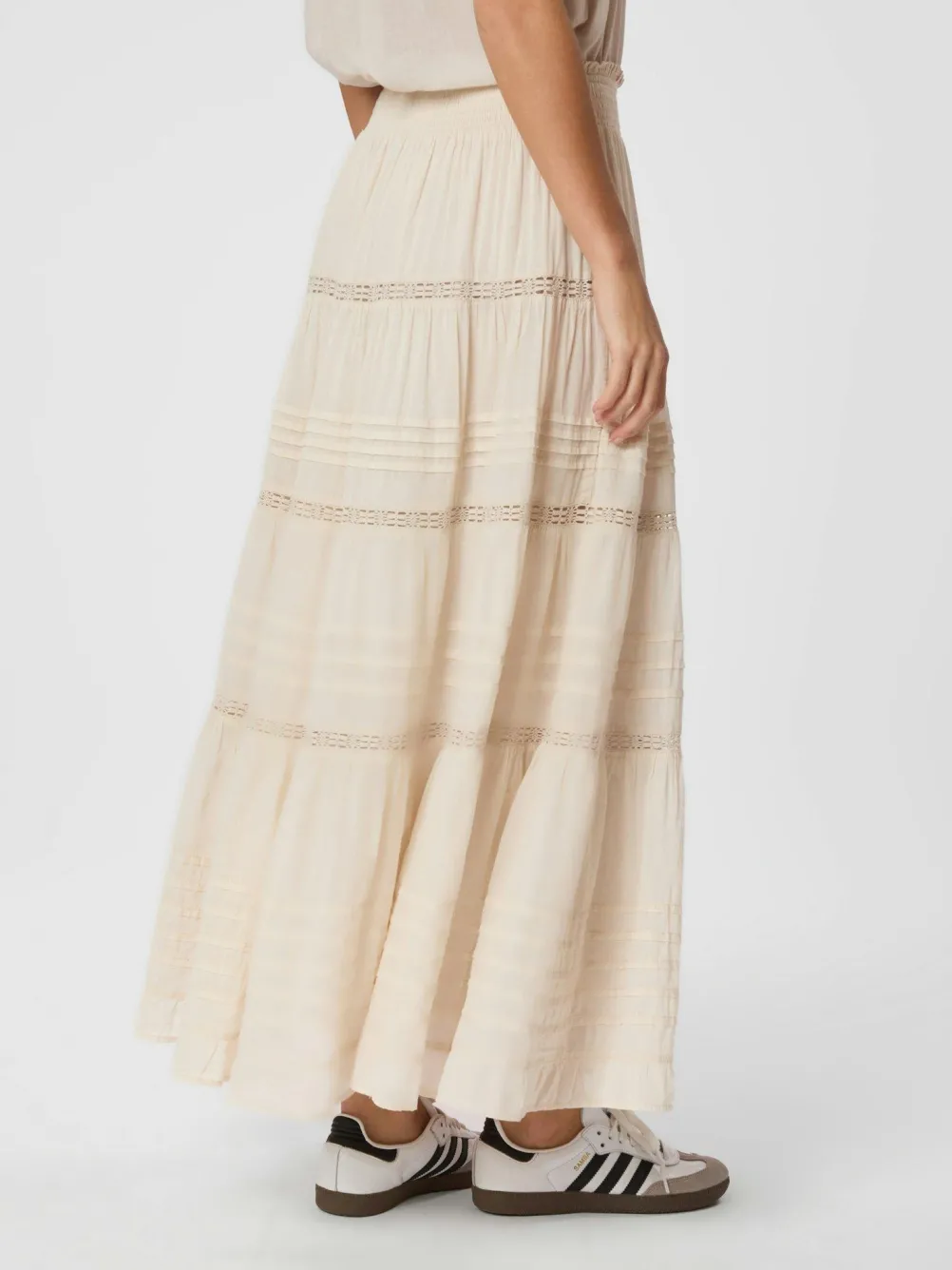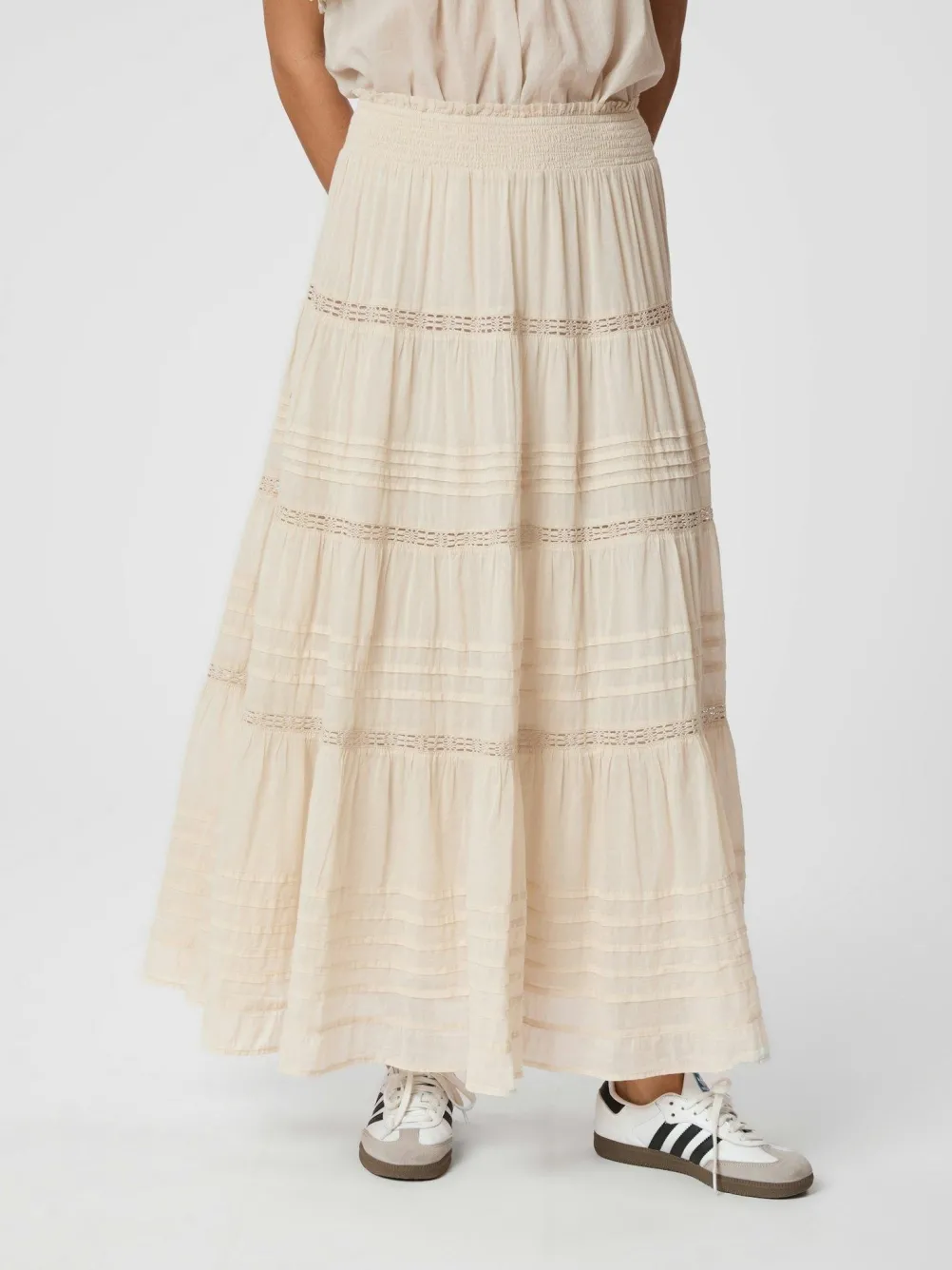 Flot lang blondenederdel fra Neo Noir lavet i cotton voile med bånddetaljer og med smock i taljen. Nederdelen har bomuldsfoer. Perfekt til både hverdag, ferie og fest.