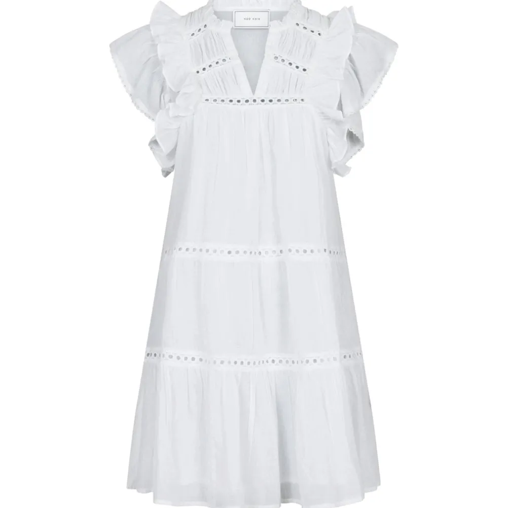 Super sød kjole fra Neo Noir med fine flæser ved skuldrene og v-udskæring. Med søde blondebond. Perfekt til både hverdag og fest.