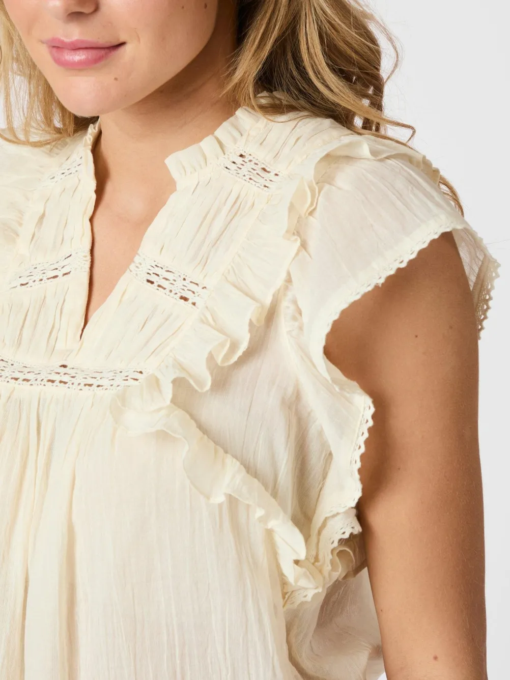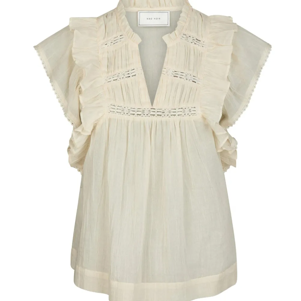 Super sød top fra Neo Noir med fine flæser ved skuldrene og v-udskæring. Med søde blondebond. Perfekt til både hverdag og fest.