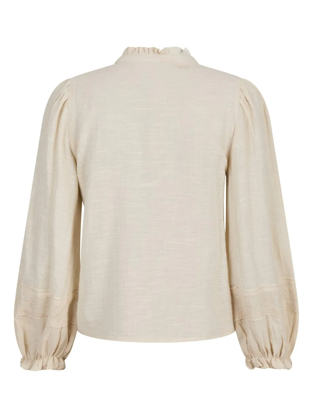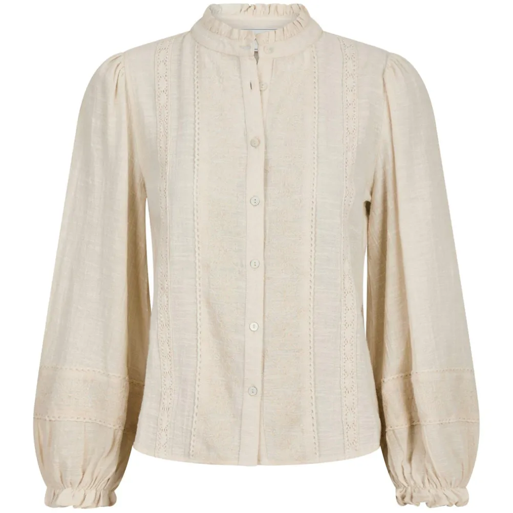 Elegant bluse fra Neo Noir med fine blondedetaljer. Med små flæser ved kraven og ved ærmerne. Med knaplukning.
