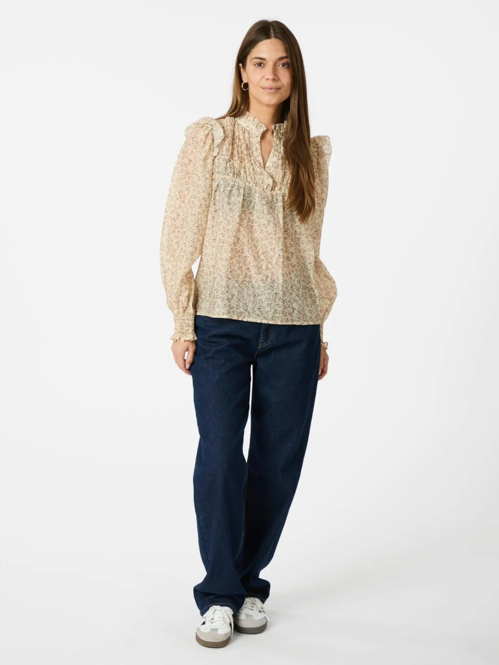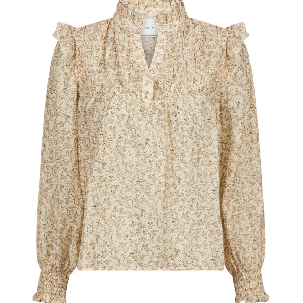 Elegant bluse fra Neo Noir med sødt grafisk print og fine flæsedetaljer. Med smock ved ærmerne.
