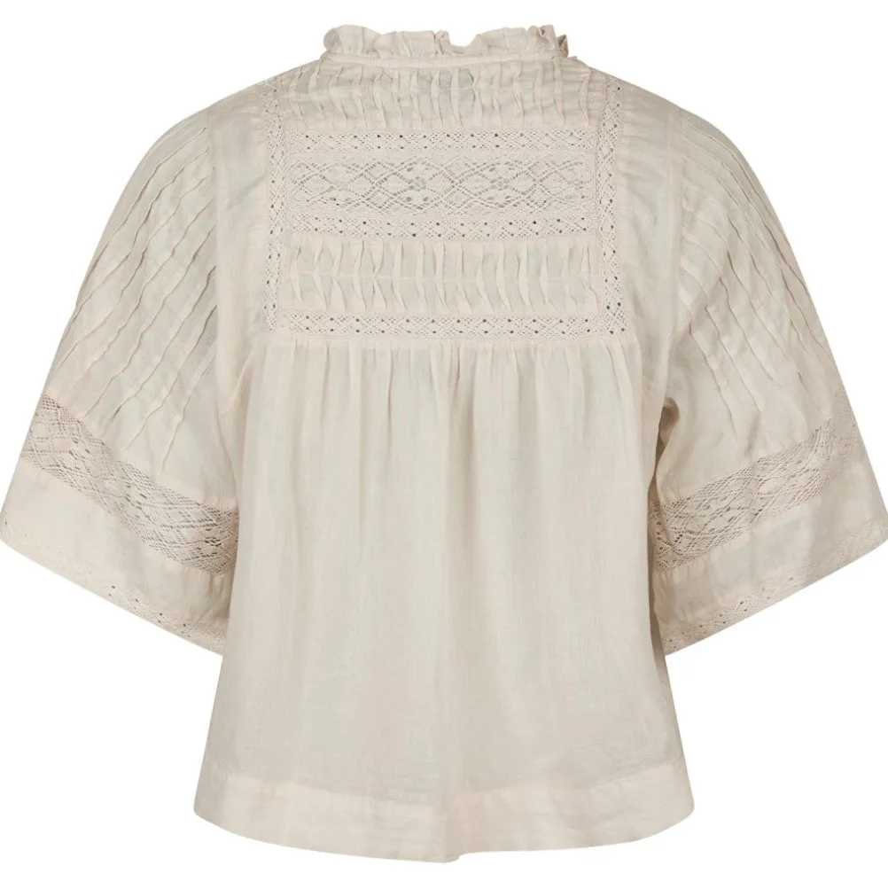 Smuk bluse fra Neo Noir med fine blonder, v-ukskæring og små flæser ved kraven. Med korte brede ærmer med blondebånd.
