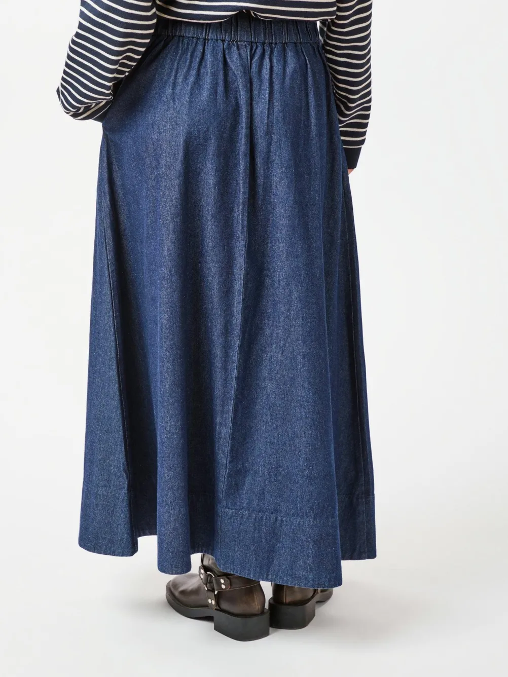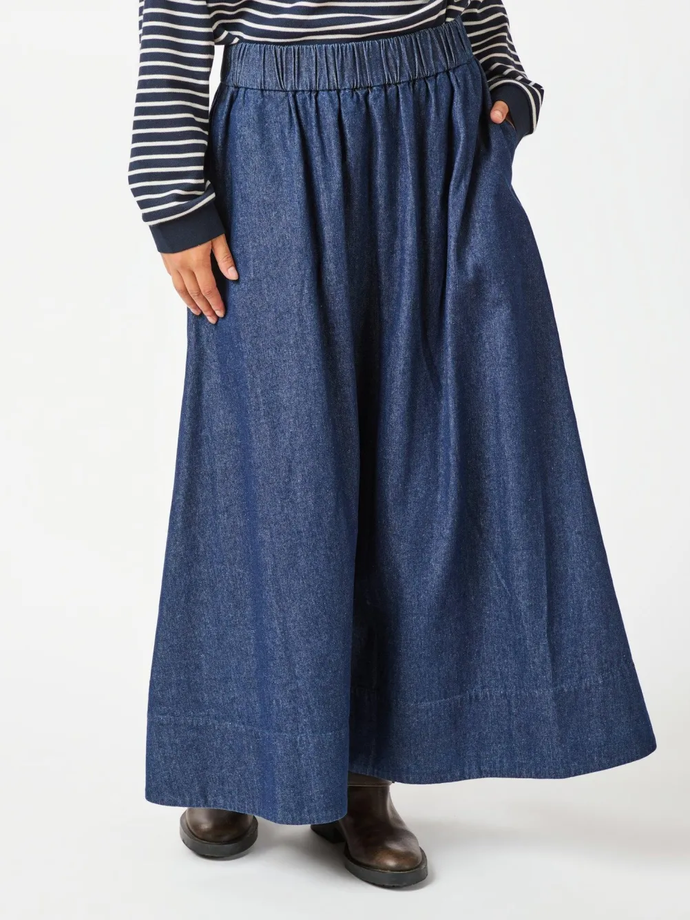 Flot lang nederdel fra Neo Noir lavet i en fin denimkvalitet. Nederdelen har en høj elastik i taljen, lommer og vidde i bunden.