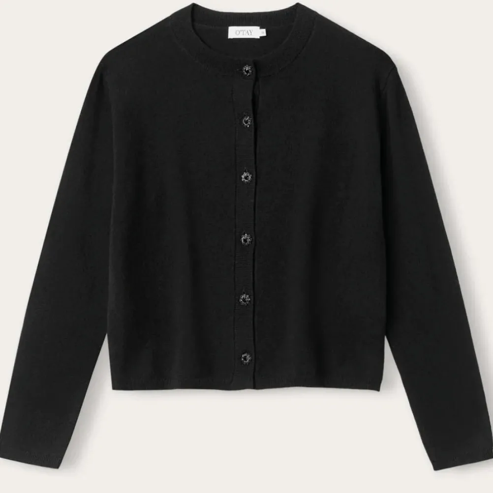 Lækker cardigan fra O’tay i 100 % uld med smukke dekorative knapper med similisten. Med rund hals og små diskrete ribkanter. Klassisk og tidløs.