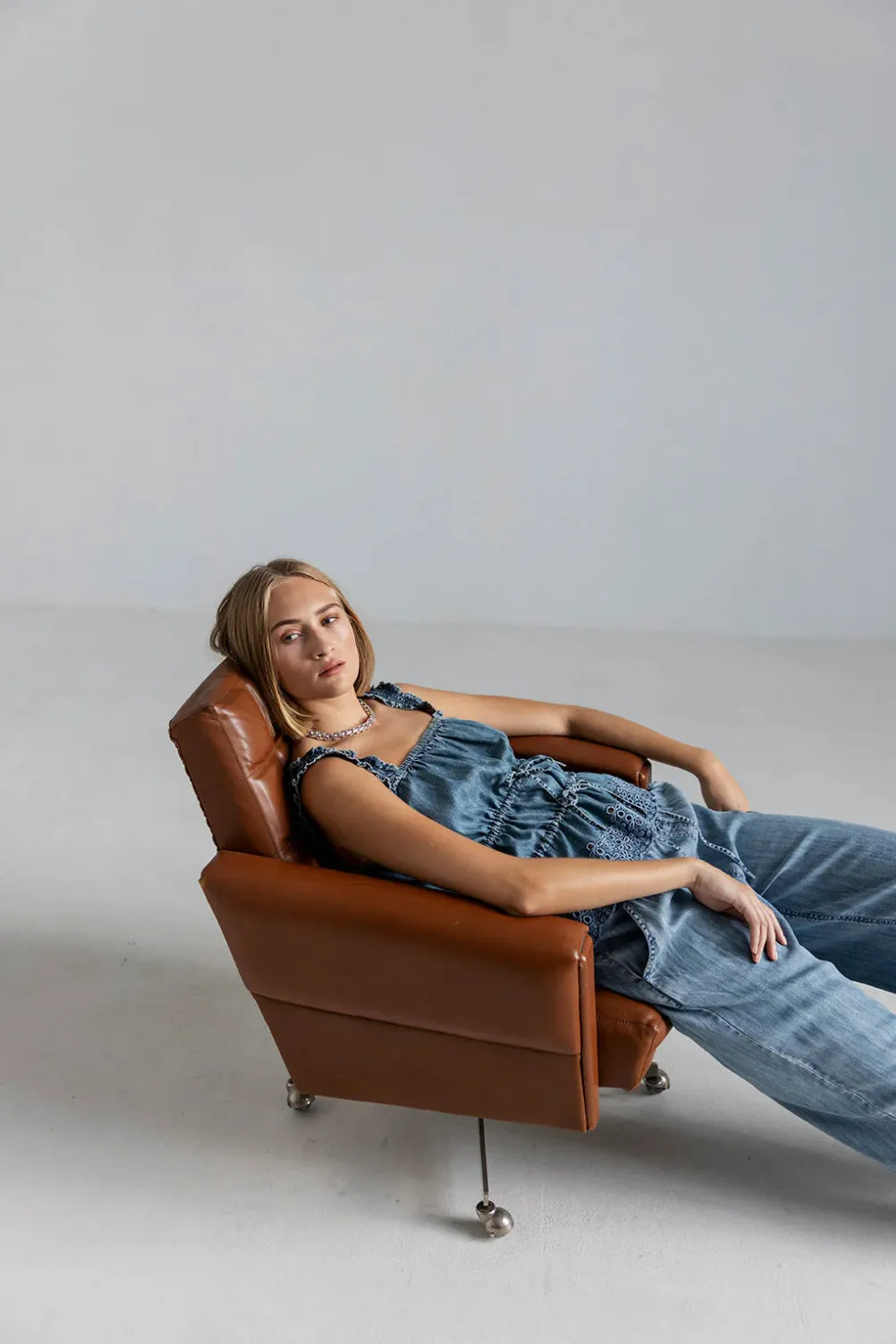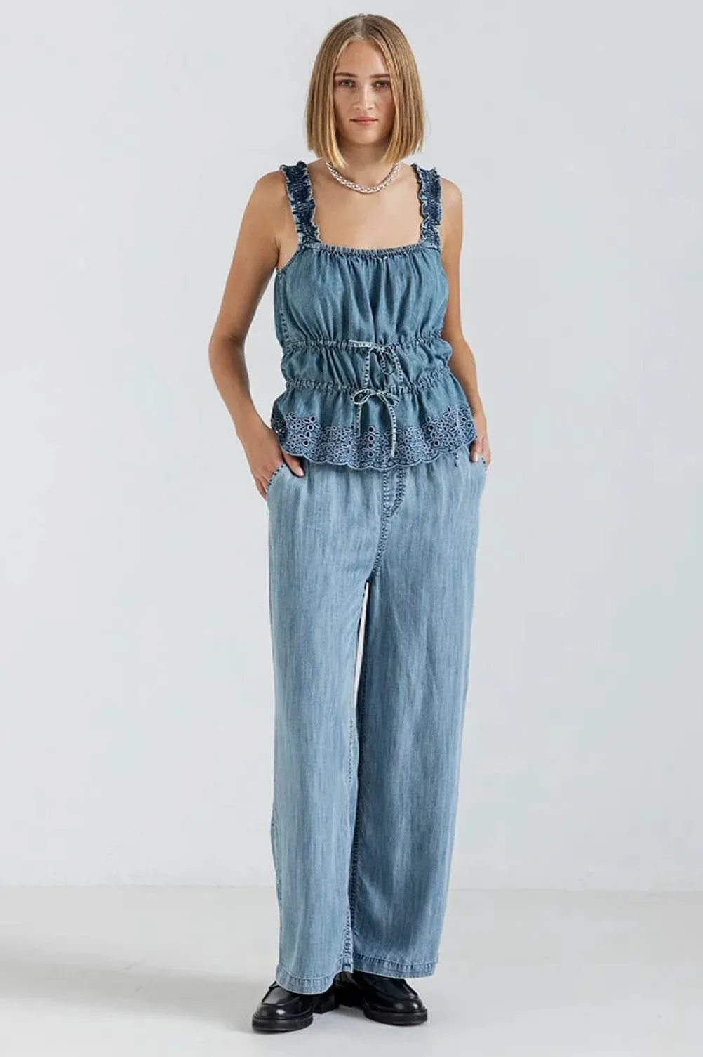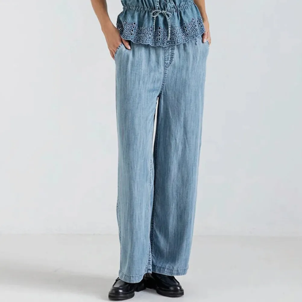 Fine løse blå denimbukser fra Project Aj117. Med lige ben, sidelommer og elastik i taljen. Bukserne er meget komfortable at bære. Modellen er iklædt en str. M.