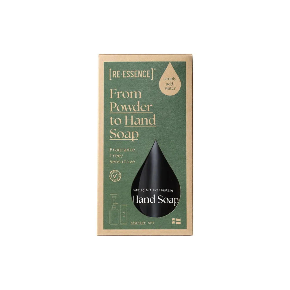 ET STARTER SÆT INDEHOLDER: 1 x genanvendelig glas sæbedispenser. 2 x pulver refills 27g (1 refill = 340ml håndsæbe). 1 x silikone tragt til påfyldning. Et starter sæt giver 2 x 340 ml nærende og fugtgivende håndsæbe af 98% naturlig oprindelse. Leveres med en elegant og genanvendelig røg-farvet glas sæbedispenser og en lille tragt til nem påfyldning.