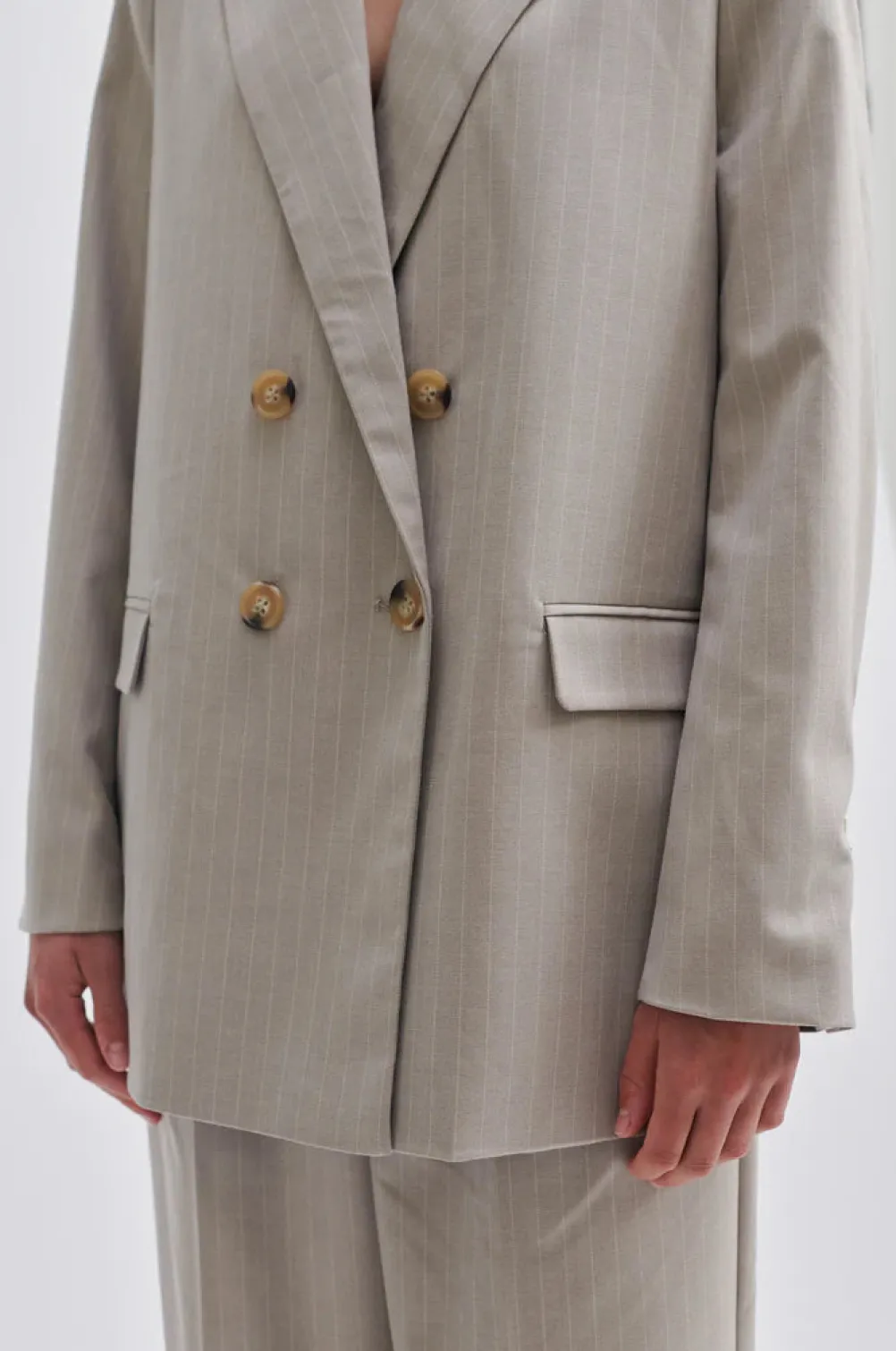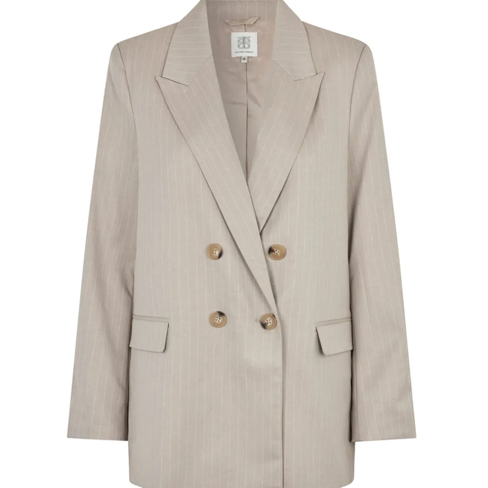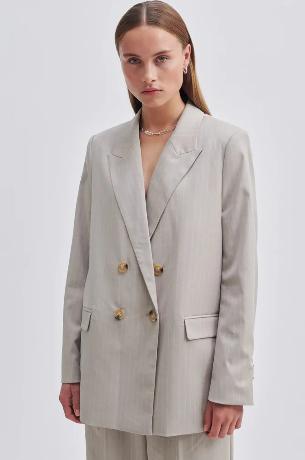 Super smuk og elegant nålestribet blazer fra Second Female fremstillet i et blødt og glat materiale. Med dobbeltlukning, revers og lommer foran.