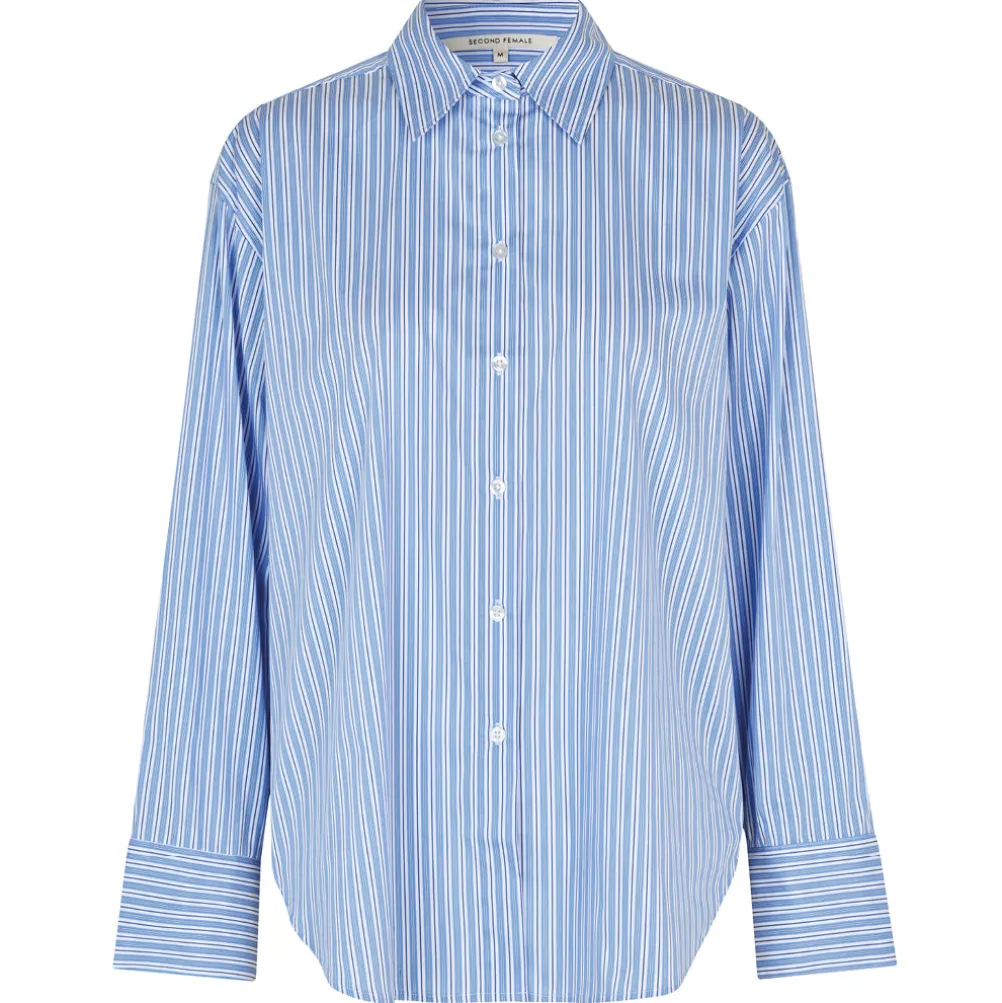 Flot klassisk skjorte fra Second Female med justerbar pasform på ryggen. Med tynde striber, klassisk krave og knaplukning langs fronten.
