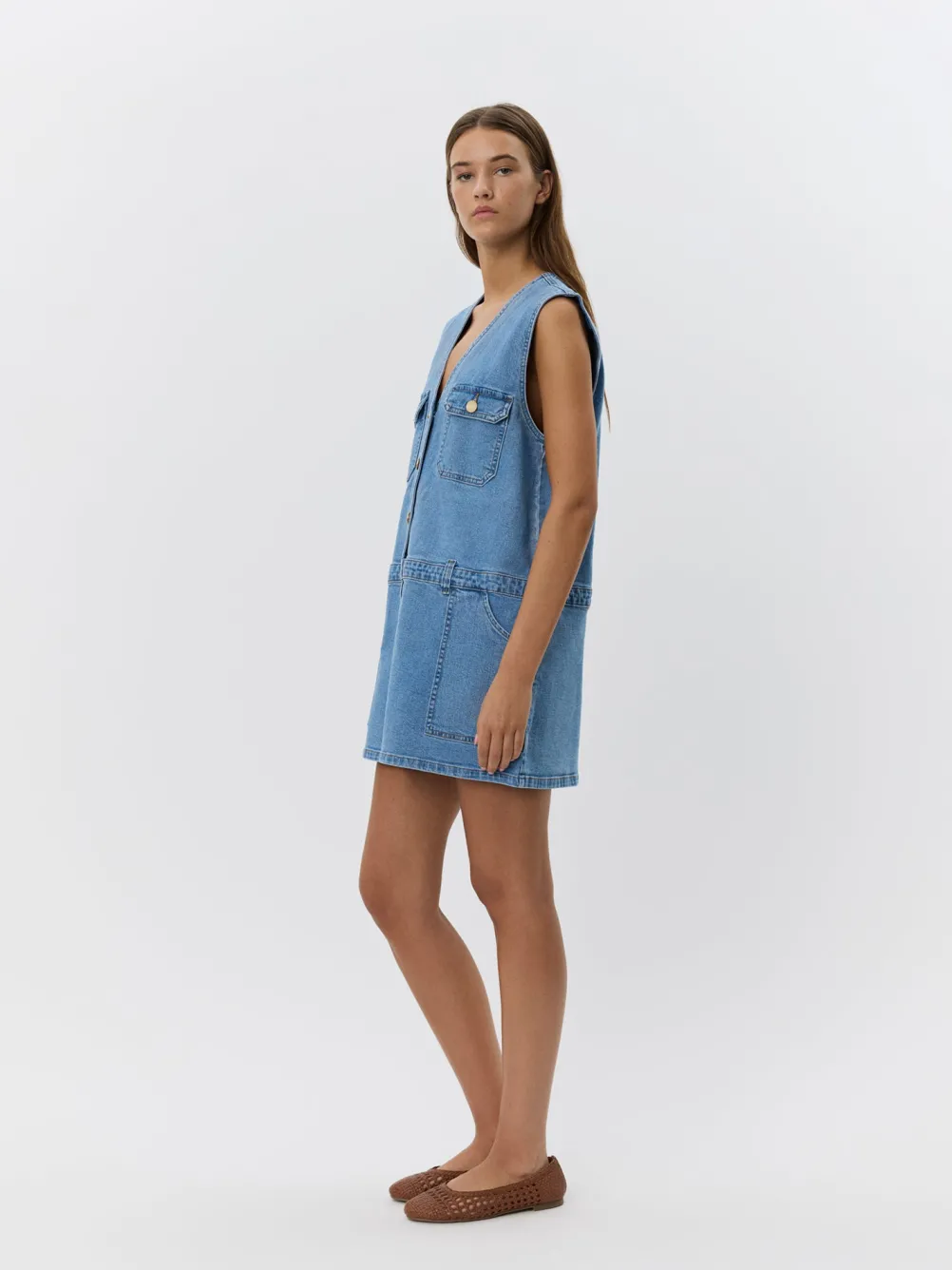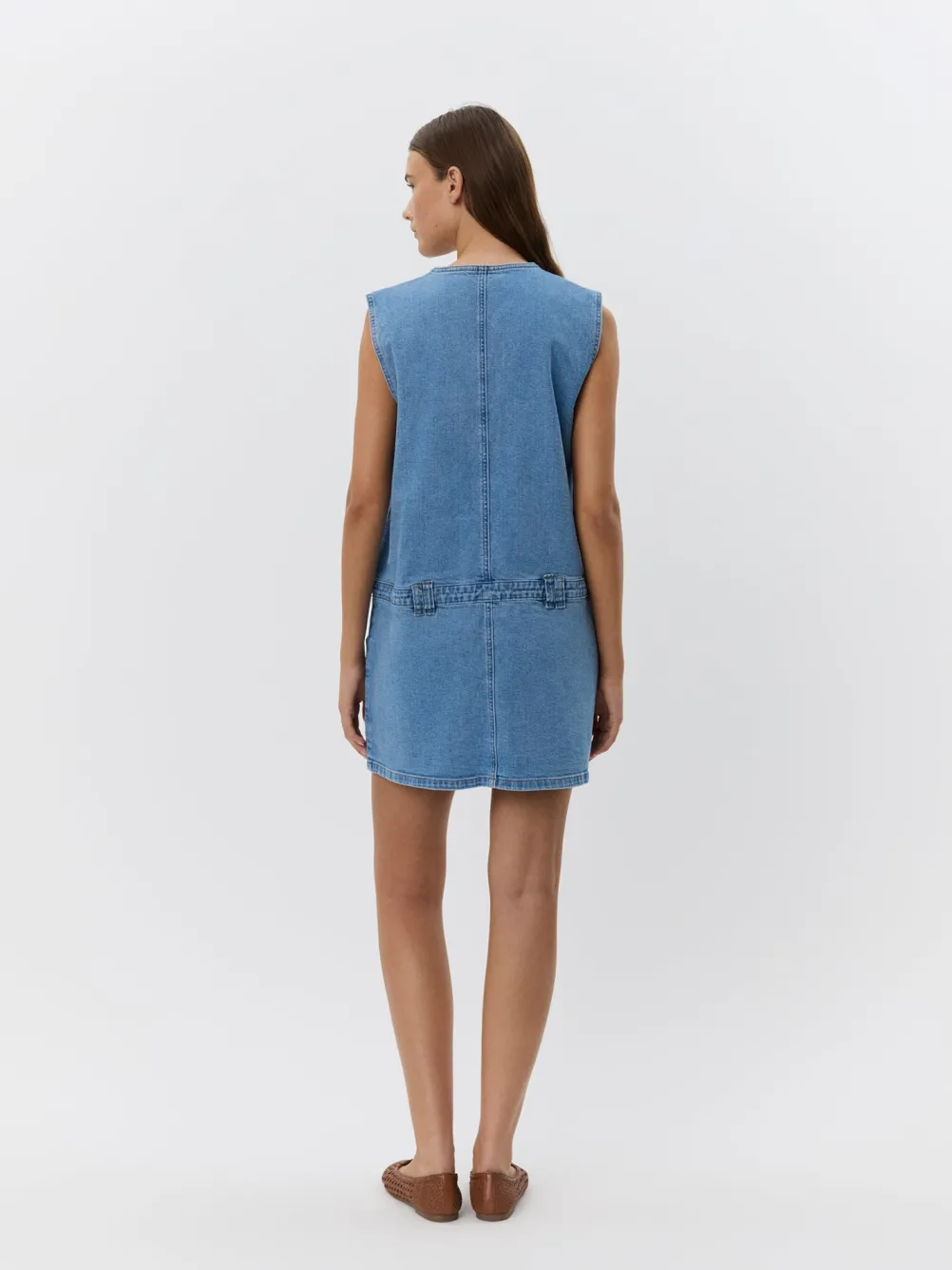 Smuk ærmeløs blå denimkjole fra Sofie Schnoot med v-udskæring og fine guldknapper. Med sidelommer og brystlommer.