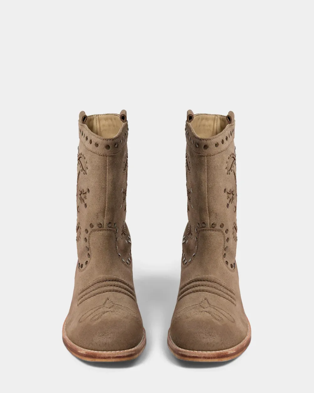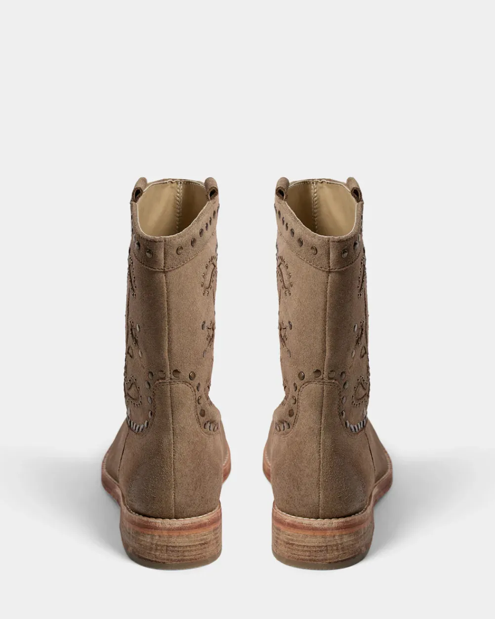Smukke ruskindsstøvler fra Sofie Schnoor med fine nitter og broderet mønster! Støvlerne har en lav hæl, rund snude og en træfarvet sål. Fremstillet i 100% ruskind med en gummisål. Et must til forårets og sommerens styles.