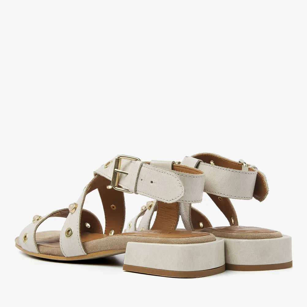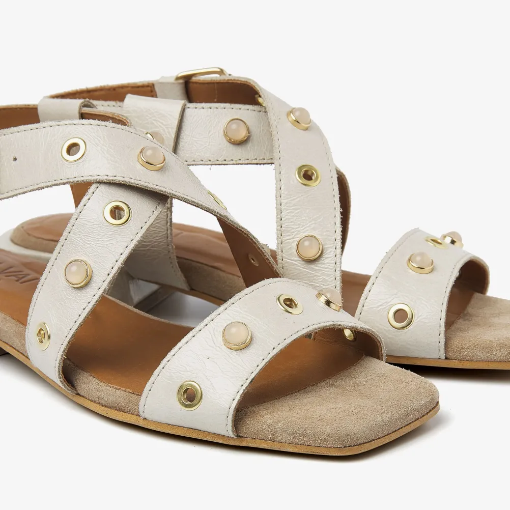 Smukke sandfarvede sandaler fra Via Vai i 100 % læder med guldfarvede nitter og fine perler på remmene. Lukkes ved anklerne. Perfekte til både hverdag og fest.