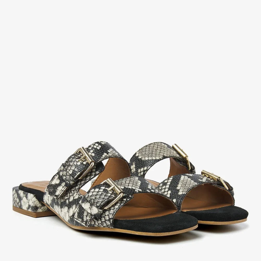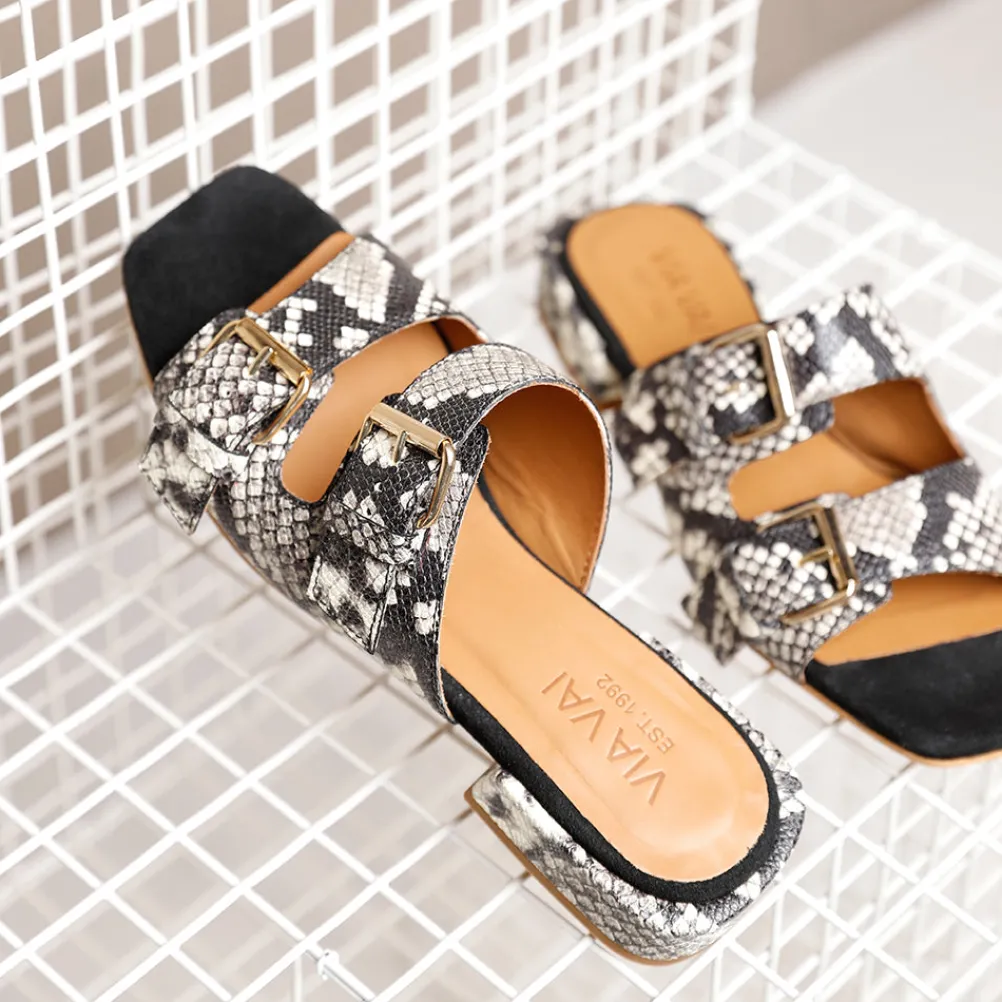 Smukke slip-in sandaler fra Via Vai i 100 % læder med slangeprint og spænder. Med lille hæl. Perfekte til både hverdag og fest.