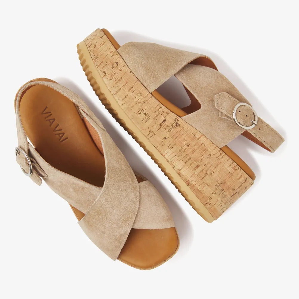 Smukke sandaler fra Via Vai med brede remme og spænde. Sandalerne er i lavet i lækkert ruskind i en flot beige farve med en god pasform.